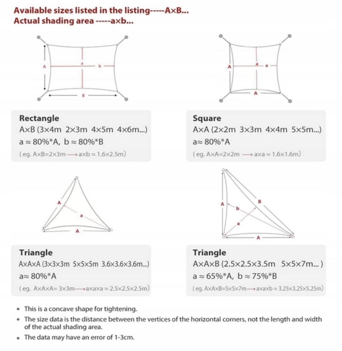 ✅ W zestawie zawiera długie liny i metalowe D-ringi. Ze względu na wklęsły kształt środkowa szerokość żagla jest krótsza, a rzeczywista powierzchnia cieniowania mniejsza. Dane dotyczące rozmiaru to odległość między punktami korony poziomych narożników, a nie długość i szerokość rzeczywistego obszaru cienia. Zaleca się mieć odległość około 45 – 60 cm od rogu tkaniny do punktu ściany/usztywnienia. Kąt montażu wynosi 20 – 42 stopnie, aby deszcz mógł spłynąć.