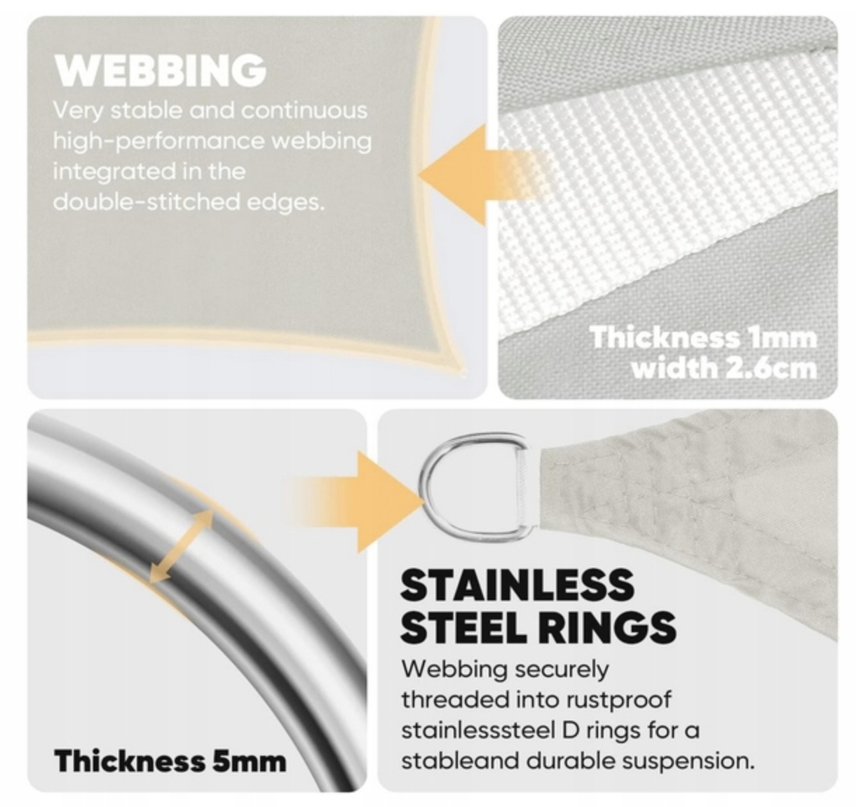 ✅ Żagiel ma podwójnie zszyte krawędzie i wzmocnione rogi zapewniające długą żywotność. Markizy mają zakrzywienie na krawędziach, aby zbudować napięcie przez żagiel. Podczas gdy rogi żagla są rozciągnięte, łuki krawędzi próbują się wyprostować. Taka konstrukcja nie tylko poprawia wytrzymałość na rozciąganie.