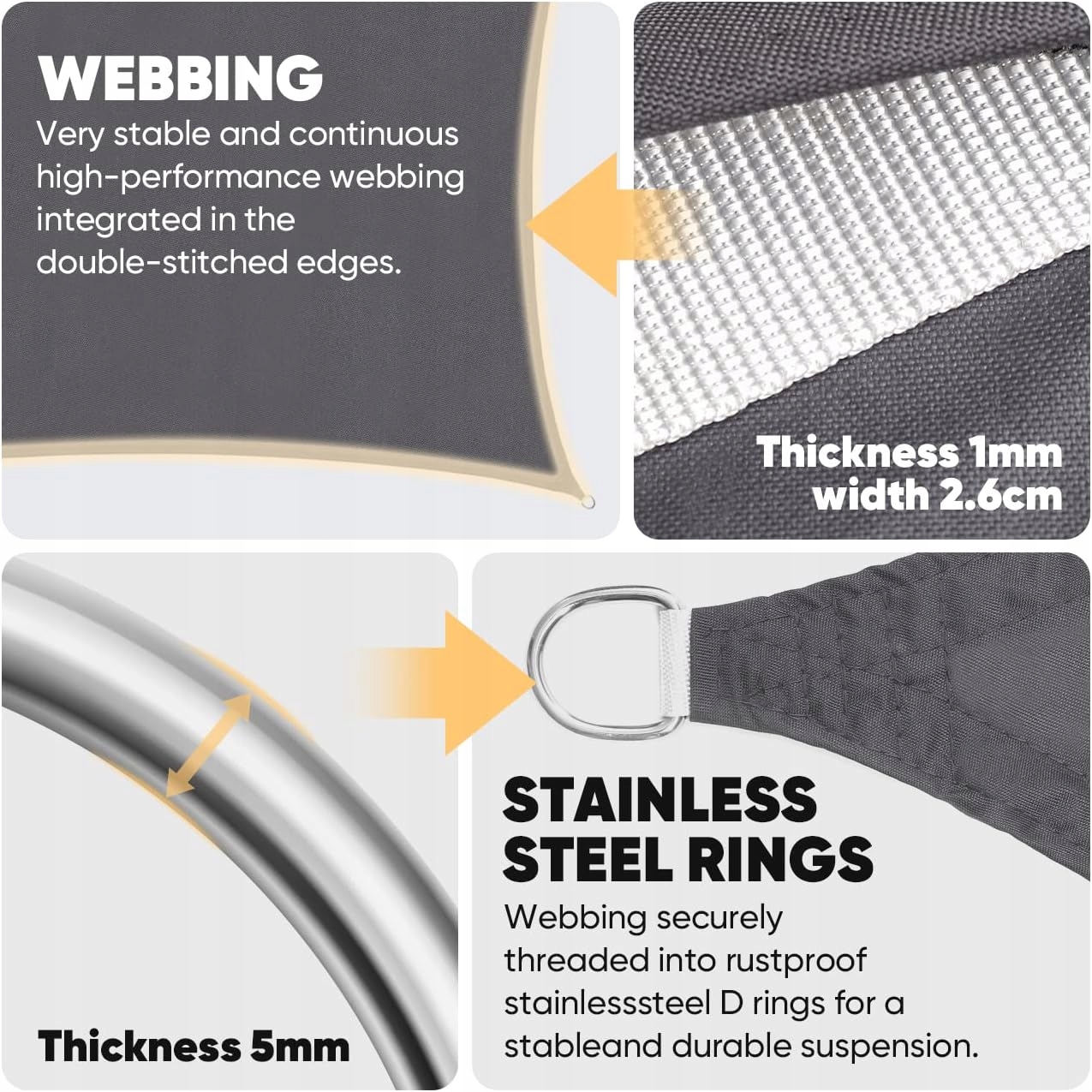 ✅ Żagiel ma podwójnie zszyte krawędzie i wzmocnione rogi zapewniające długą żywotność. Markizy mają zakrzywienie na krawędziach, aby zbudować napięcie przez żagiel. Podczas gdy rogi żagla są rozciągnięte, łuki krawędzi próbują się wyprostować. Taka konstrukcja nie tylko poprawia wytrzymałość na rozciąganie.