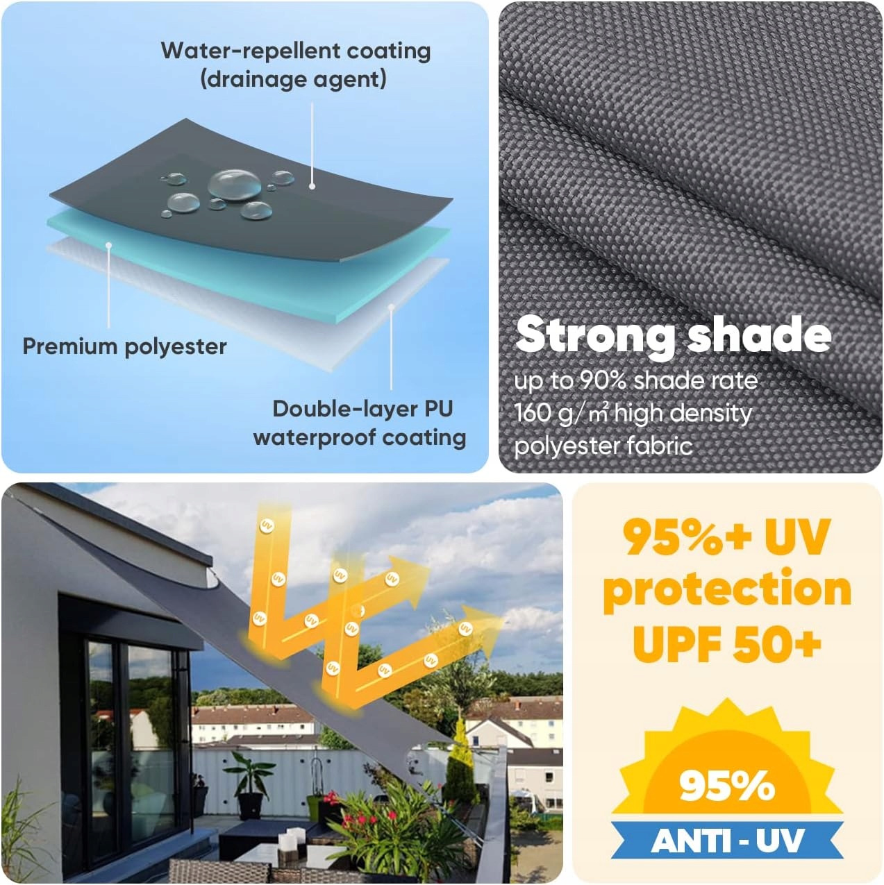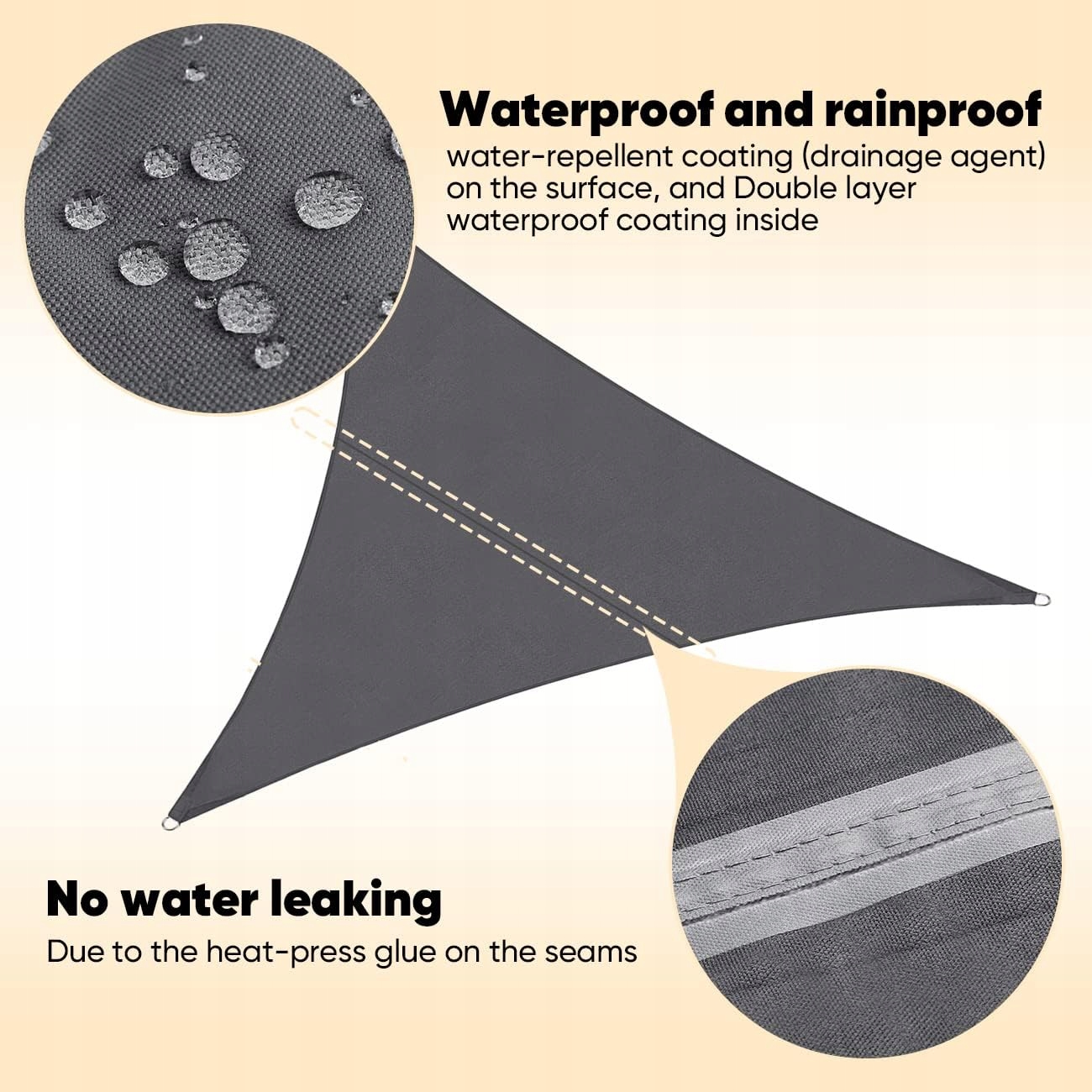 ✅ Przeciwsłoneczny żagiel w 100% wykonany z wysokiej jakości i gęstej tkaniny poliestrowej, wodoodporny materiał na powierzchni, podwójna powłoka PU wewnątrz, trwała i bezpieczna. Jest odporny na światło, wodoodporny, rozdarcia, odporny na warunki atmosferyczne i wolny od pleśni i plam.
