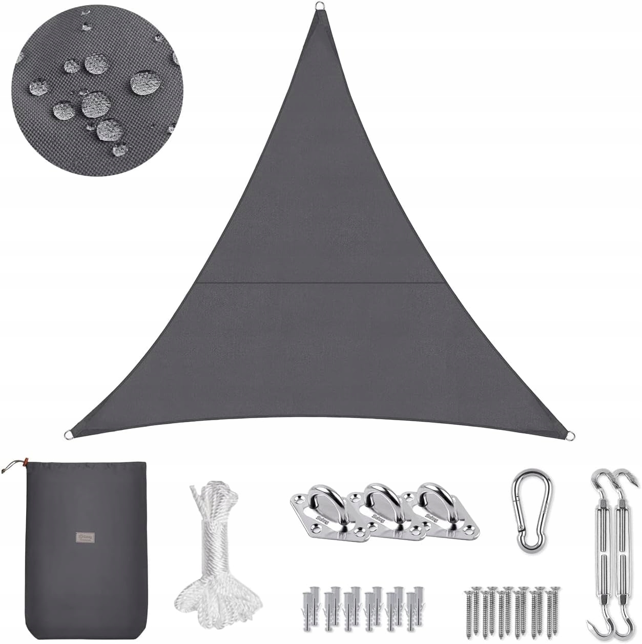 ✅ W zestawie zawiera długie liny i metalowe D-ringi. Ze względu na wklęsły kształt środkowa szerokość żagla jest krótsza, a rzeczywista powierzchnia cieniowania mniejsza. Dane dotyczące rozmiaru to odległość między punktami korony poziomych narożników, a nie długość i szerokość rzeczywistego obszaru cienia. Zaleca się mieć odległość około 45 – 60 cm od rogu tkaniny do punktu ściany/usztywnienia. Kąt montażu wynosi 20 – 42 stopnie, aby deszcz mógł spłynąć.