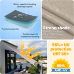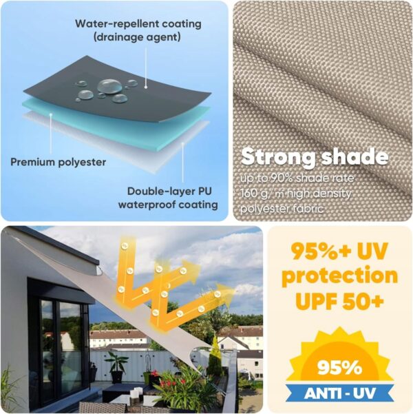✅ Przeciwsłoneczny żagiel w 100% wykonany z wysokiej jakości i gęstej tkaniny poliestrowej, wodoodporny materiał na powierzchni, podwójna powłoka PU wewnątrz, trwała i bezpieczna. Jest odporny na światło, wodoodporny, rozdarcia, odporny na warunki atmosferyczne i wolny od pleśni i plam.