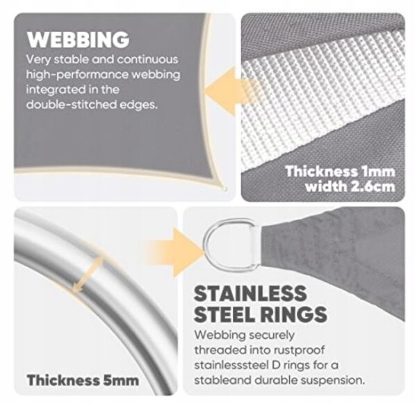 ✅ Żagiel ma podwójnie zszyte krawędzie i wzmocnione rogi zapewniające długą żywotność. Markizy mają zakrzywienie na krawędziach, aby zbudować napięcie przez żagiel. Podczas gdy rogi żagla są rozciągnięte, łuki krawędzi próbują się wyprostować. Taka konstrukcja nie tylko poprawia wytrzymałość na rozciąganie.