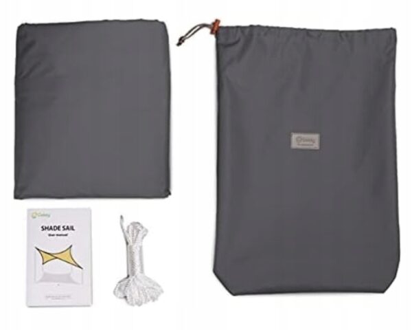 ✅ W zestawie zawiera długie liny i metalowe D-ringi. Ze względu na wklęsły kształt środkowa szerokość żagla jest krótsza, a rzeczywista powierzchnia cieniowania mniejsza. Dane dotyczące rozmiaru to odległość między punktami korony poziomych narożników, a nie długość i szerokość rzeczywistego obszaru cienia. Zaleca się mieć odległość około 45 – 60 cm od rogu tkaniny do punktu ściany/usztywnienia. Kąt montażu wynosi 20 – 42 stopnie, aby deszcz mógł spłynąć.