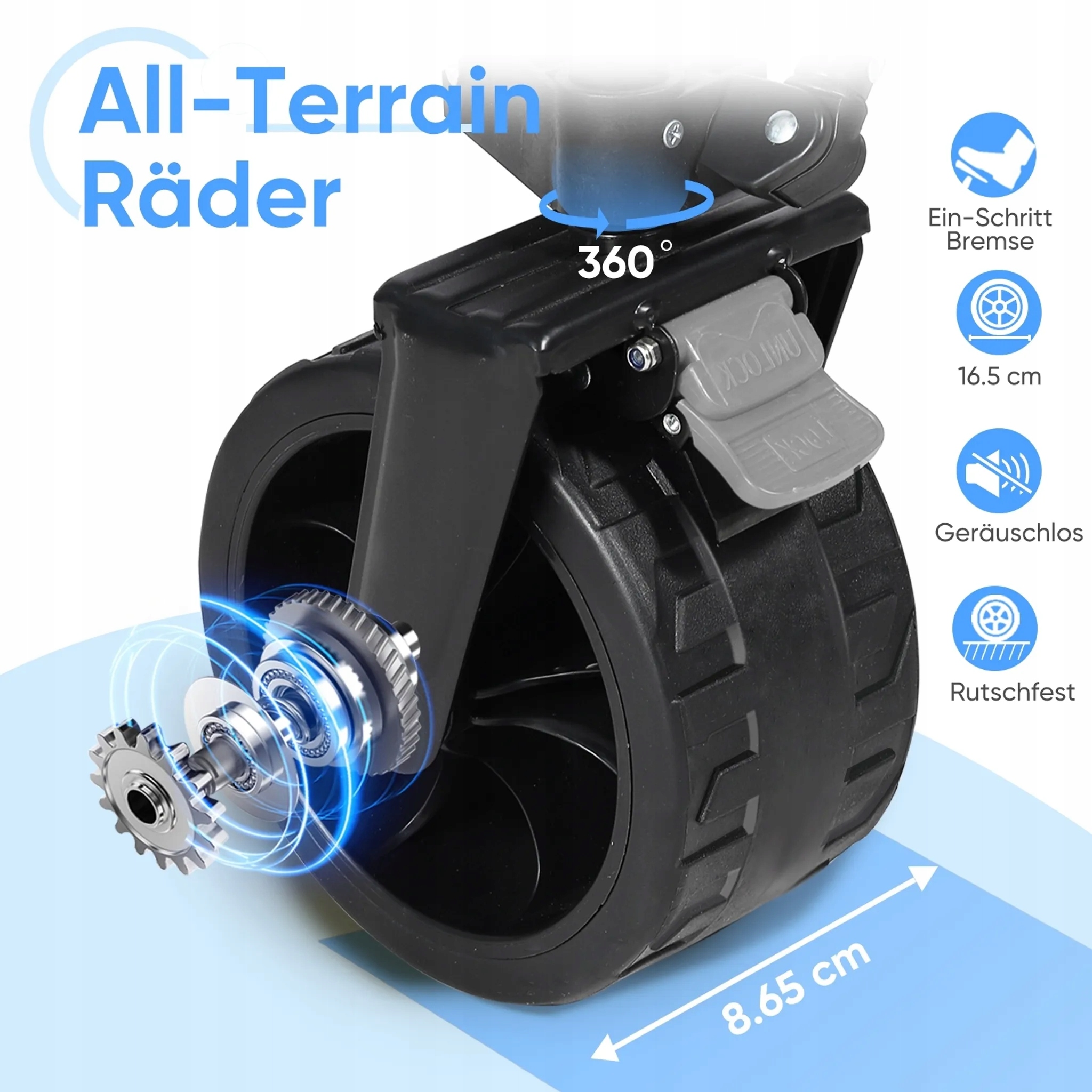 Ergonomiczny uchwyt z mechanizmem jednego kliknięcia pozwala na łatwe sterowanie wózkiem nawet na nierównym terenie.