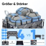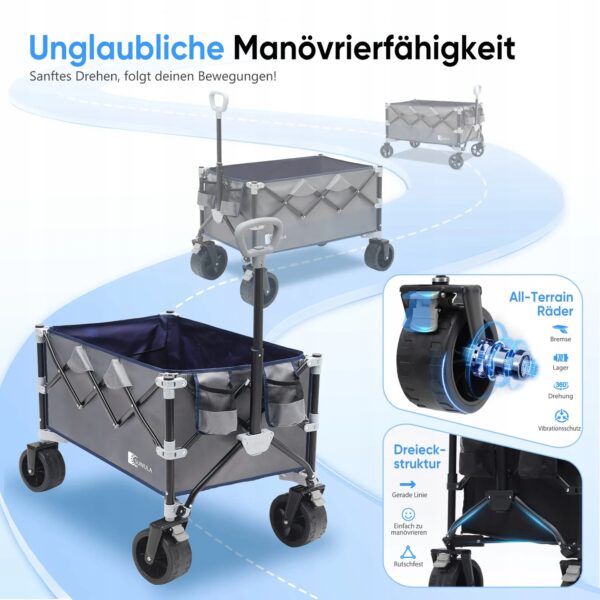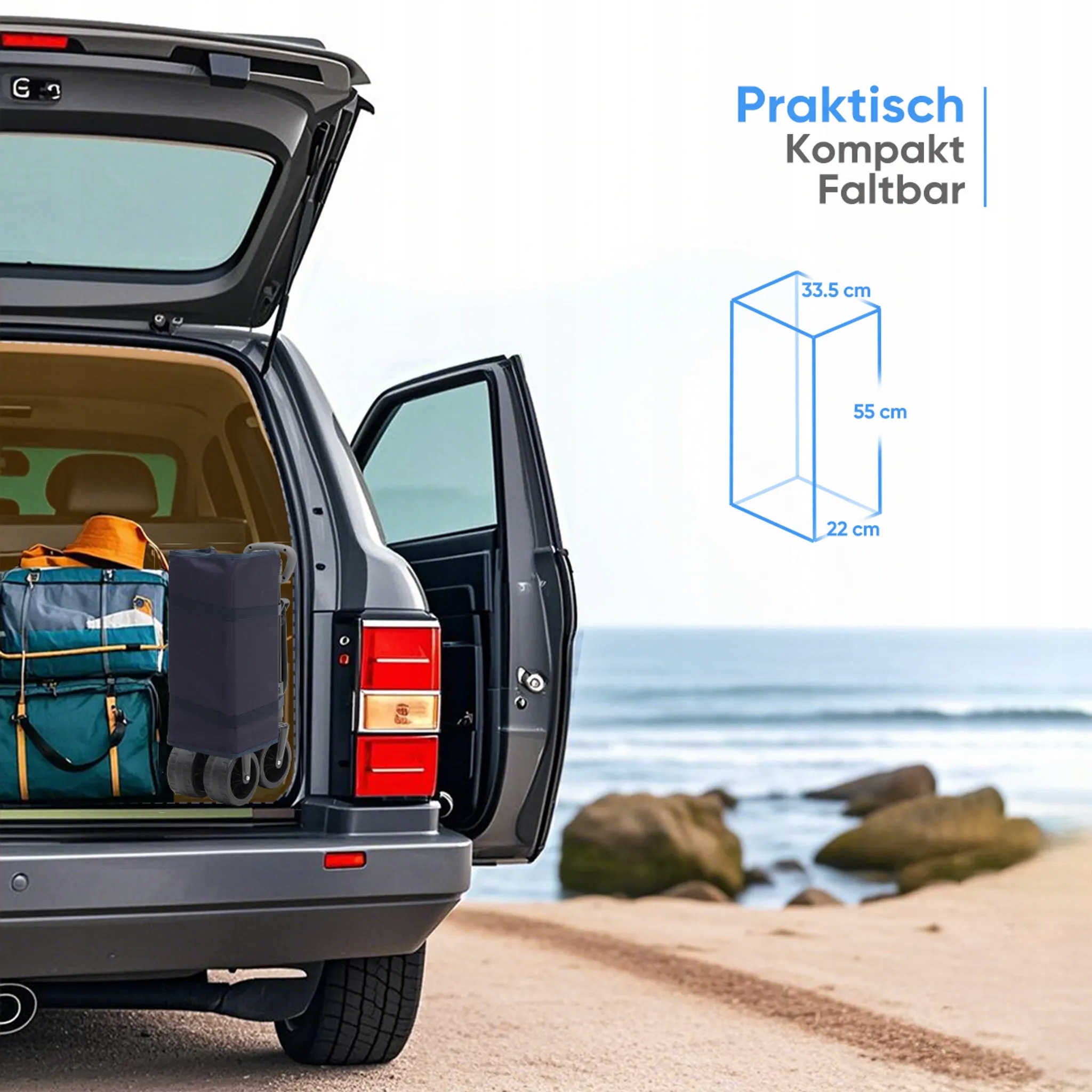 Wózek oferuje ponad 150 litrów przestrzeni ładunkowej, a po złożeniu zajmuje mniej niż 0,04 m³. Idealny do transportu zakupów, sprzętu kempingowego, bagażu lub akcesoriów podczas wyjazdów rodzinnych. Łączy dużą pojemność z kompaktowością, dzięki czemu łatwo zmieścisz go w bagażniku samochodu lub schowku.