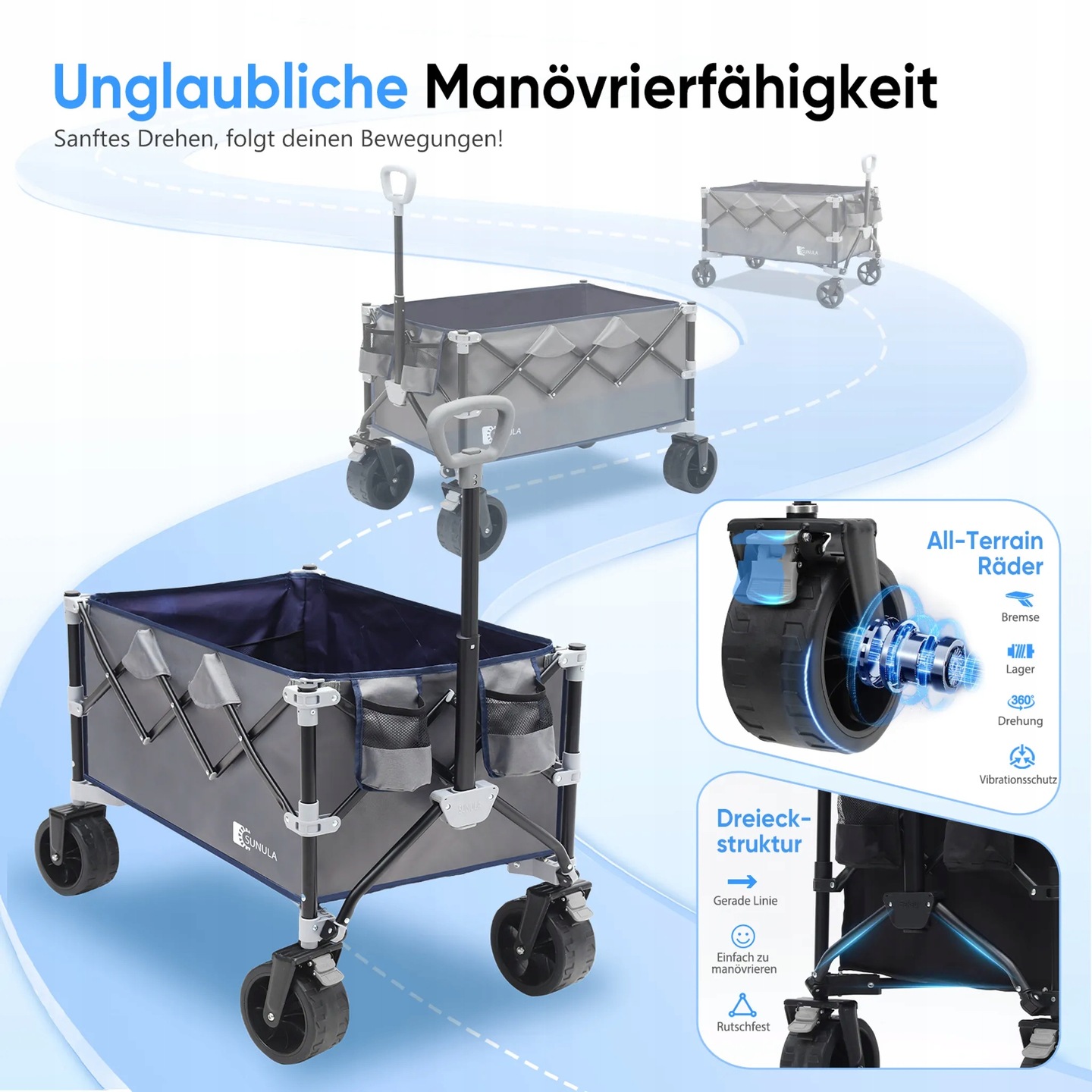 Wózek transportowy SUNULA 200KG łączy solidność z innowacyjnymi rozwiązaniami. Zaawansowany system blokujący zapewnia pełną stabilność nawet przy maksymalnym obciążeniu – wózek nie składa się ani nie chwieje. Mechanizm szybkiego składania umożliwia złożenie wózka w kilka sekund za pomocą linki – bez wysiłku i bez narzędzi.
