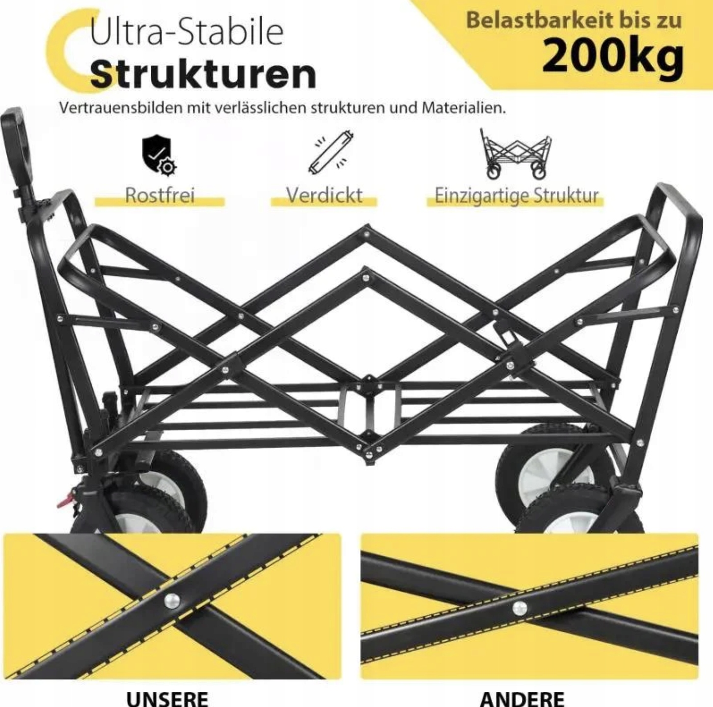 Rama wykonana z podwójnie wzmacnianej stali zapewnia wysoką trwałość i odporność na obciążenia. Wózek świetnie sprawdzi się zarówno podczas prac ogrodowych, jak i w czasie wyjazdów czy transportu cięższego sprzętu.