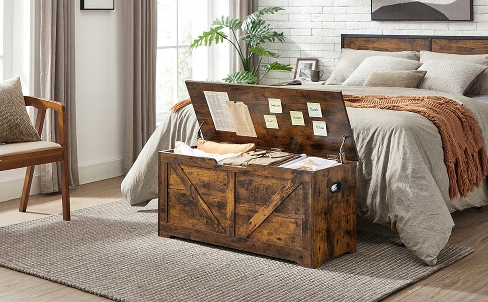 Połącz funkcjonalność z klimatem rustykalnym. Ta stylowa skrzynia z drzwiami w stylu stodoły wprowadzi do wnętrza ciepło i przytulny charakter, a jednocześnie pomoże utrzymać porządek.