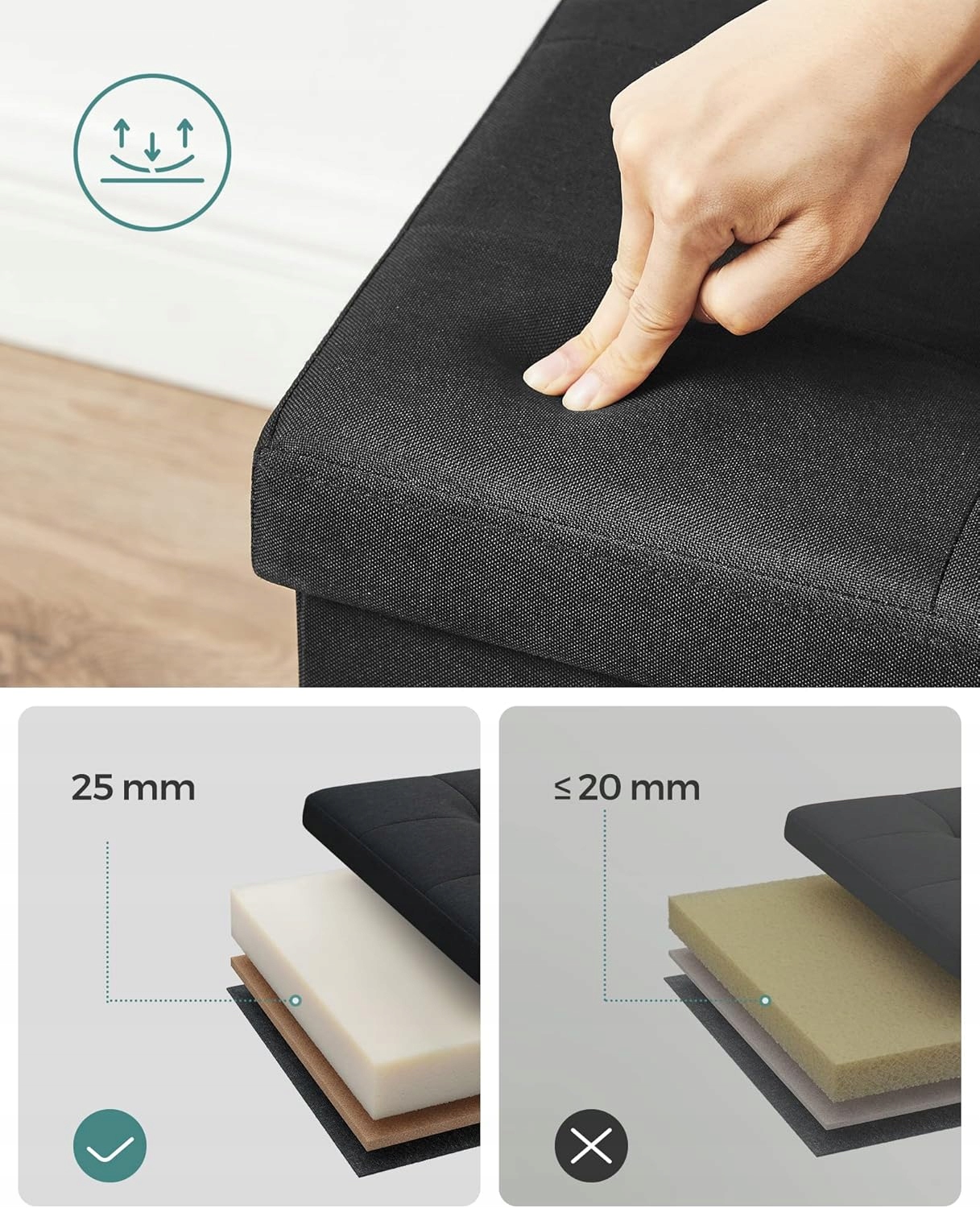 Stylowy taboret z pojemnikiem SONGMICS to praktyczne rozwiązanie 2 w 1 – wygodne siedzisko oraz pojemna skrzynia do przechowywania. Idealny do salonu, sypialni, przedpokoju czy garderoby.