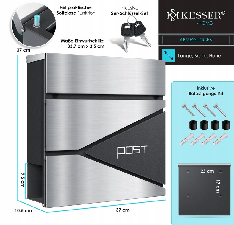 Skrzynka na listy marki KESSER to doskonałe połączenie funkcjonalności, estetyki oraz trwałości. Wykonana z wysokiej jakości stali pokrytej proszkowo, zapewnia długotrwałą odporność na warunki atmosferyczne oraz uszkodzenia mechaniczne. Dzięki nowoczesnemu wyglądowi i przemyślanym rozwiązaniom, idealnie sprawdzi się przy każdym wejściu – zarówno w domach jednorodzinnych, jak i budynkach mieszkalnych czy biurowych.