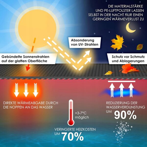Dzięki specjalnej konstrukcji z gładką powierzchnią i bąbelkami po spodniej stronie, folia solarna skutecznie pochłania promienie słoneczne i przekazuje ciepło bezpośrednio do wody. Temperatura może wzrosnąć nawet o 3–7°C, co pozwala znacznie obniżyć zużycie energii i zredukować koszty ogrzewania nawet o 70%.