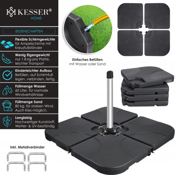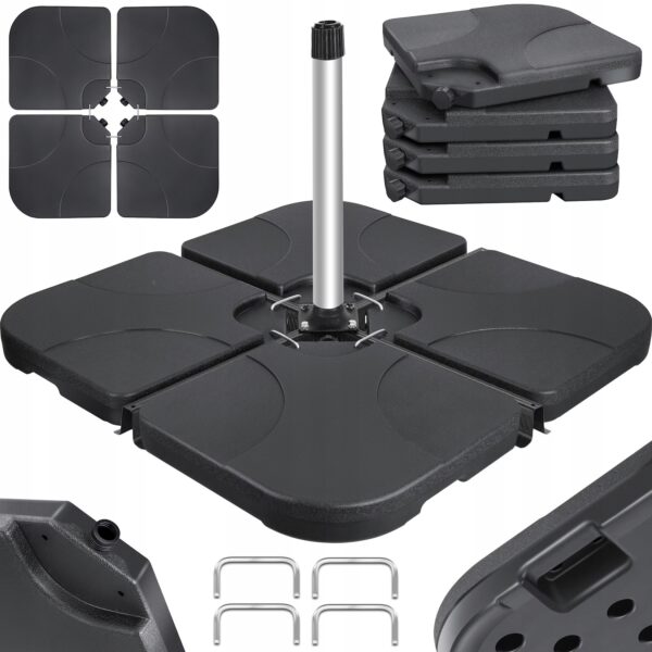 Elementy podstawy należy samodzielnie obciążyć, w tym celu należy każdy z nich wypełnić wodą lub piaskiem, sam zdecyduj, co sprawdzi się lepiej u ciebie, następnie szczelnie dokręcić zamknięcie. Zalecamy dociążyć elementy w miejscu, w którym docelowo ma stać parasol, gdyż waga całej podstawy razem z obciążeniem może wynosić od 60 do 80kg, w zależności od rodzaju wypełnienia, w tej sytuacji może być ciężko przemieścić całą konstrukcję.