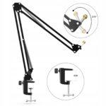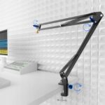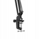 Ramię mikrofonowe wyposażono w ulepszony zacisk biurkowy z podkładką odporną na zarysowania, co chroni powierzchnię mebli przed uszkodzeniem. Stabilna konstrukcja i blokujące pokrętła gwarantują, że mikrofon pozostaje w wybranej pozycji bez ryzyka przypadkowego przesunięcia. Składana forma pozwala na wygodne przenoszenie oraz oszczędność miejsca, co czyni wysięgnik niezwykle funkcjonalnym i bezpiecznym w użytkowaniu.