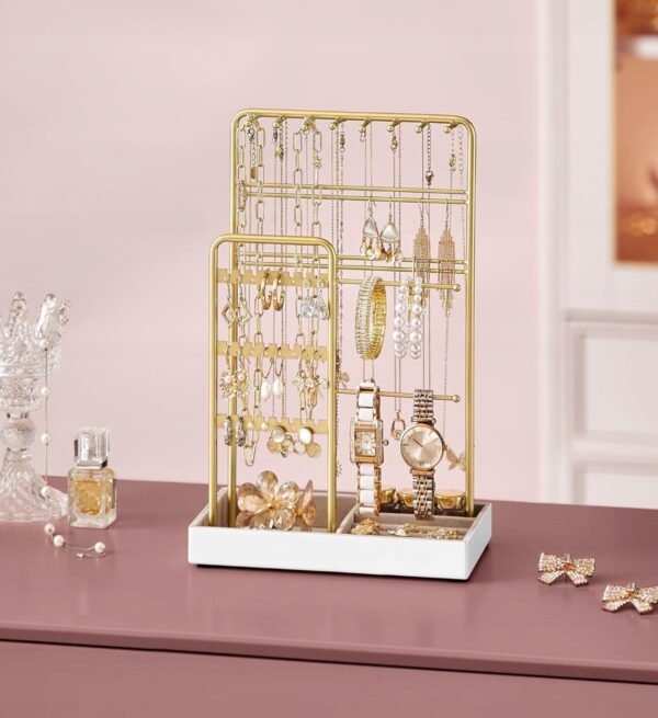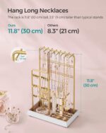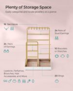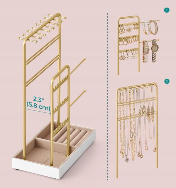 Elegancki i praktyczny stojak na biżuterię SONGMICS pozwala na wygodne przechowywanie naszyjników, kolczyków, pierścionków, bransoletek i zegarków. Posiada dwie niezależne strefy z przodu i z tyłu, dzięki czemu unikniesz plątania się biżuterii i maksymalnie wykorzystasz przestrzeń na stole.