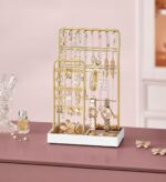 Metalowa konstrukcja i stabilna podstawa zapewniają wytrzymałość, a miękka welurowa wyściółka chroni cenne elementy przed zarysowaniami. Wyższy tylny metalowy stelaż pozwala powiesić także długie naszyjniki, których nie pomieści standardowy stojak.