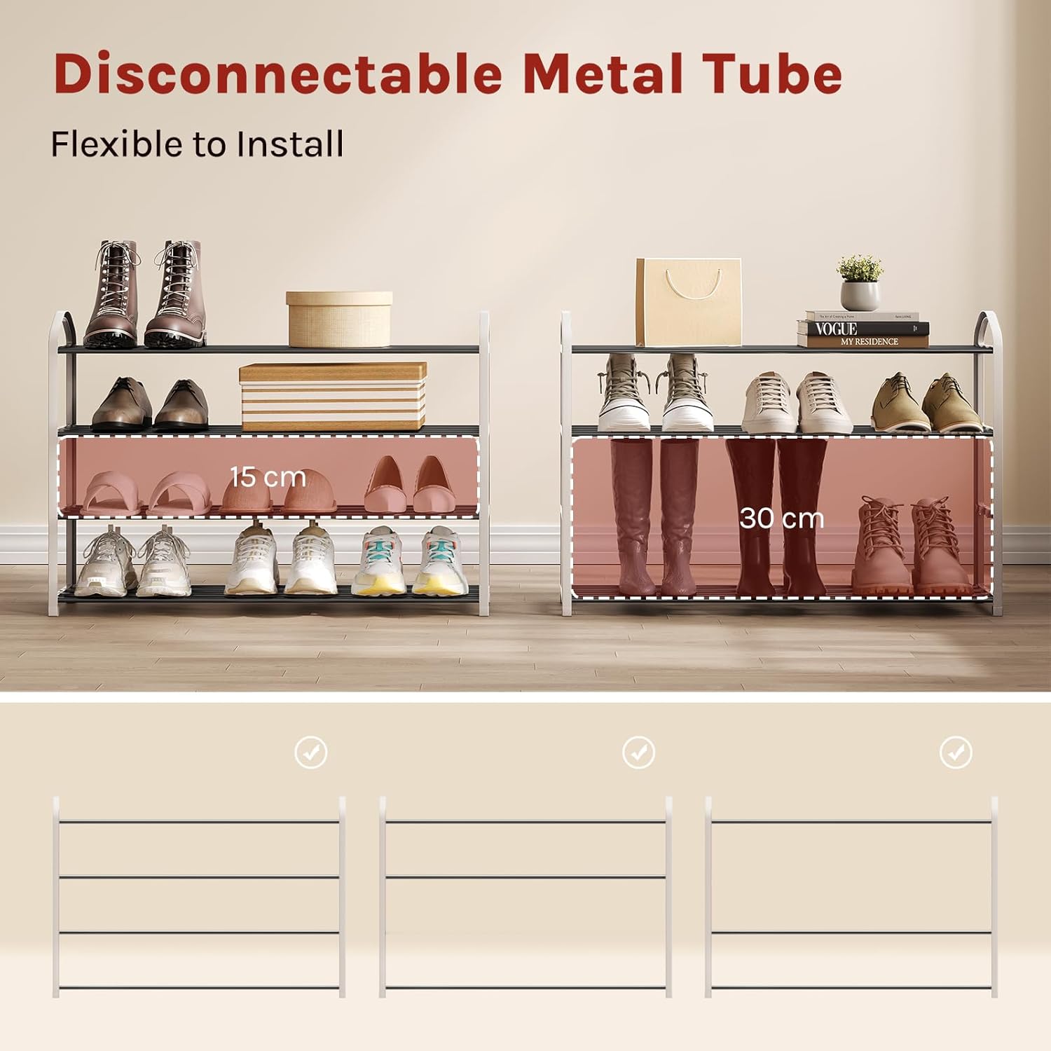 ✅ Elastyczny montaż DIY – wyjmowane rurki pozwalają dopasować wysokość półek do potrzeb, łatwy montaż bez narzędzi w 5 minut