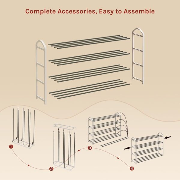 ✅ Pomieści do 16 par butów – 4 półki o wysokości 16-17 cm między poziomami, idealne na obcasy, sneakersy i inne akcesoria