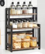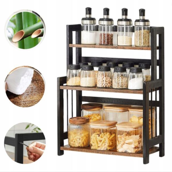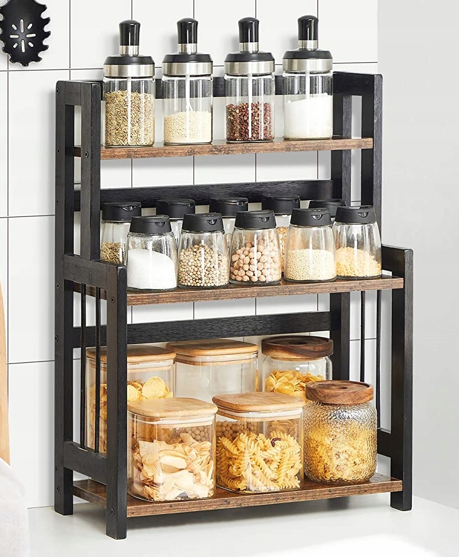 Utrzymaj porządek na blacie dzięki 3-poziomowemu regałowi na przyprawy SONGMICS. Solidna konstrukcja z bambusa i MDF gwarantuje stabilność, a eleganckie połączenie vintage brązu i czerni pasuje do każdej kuchni i wnętrza.