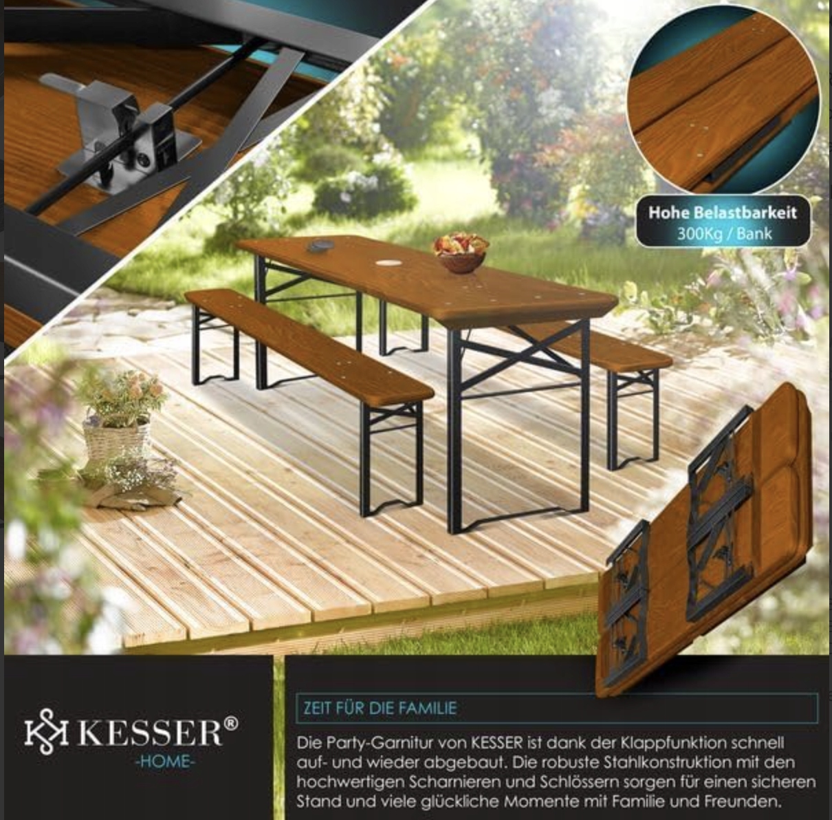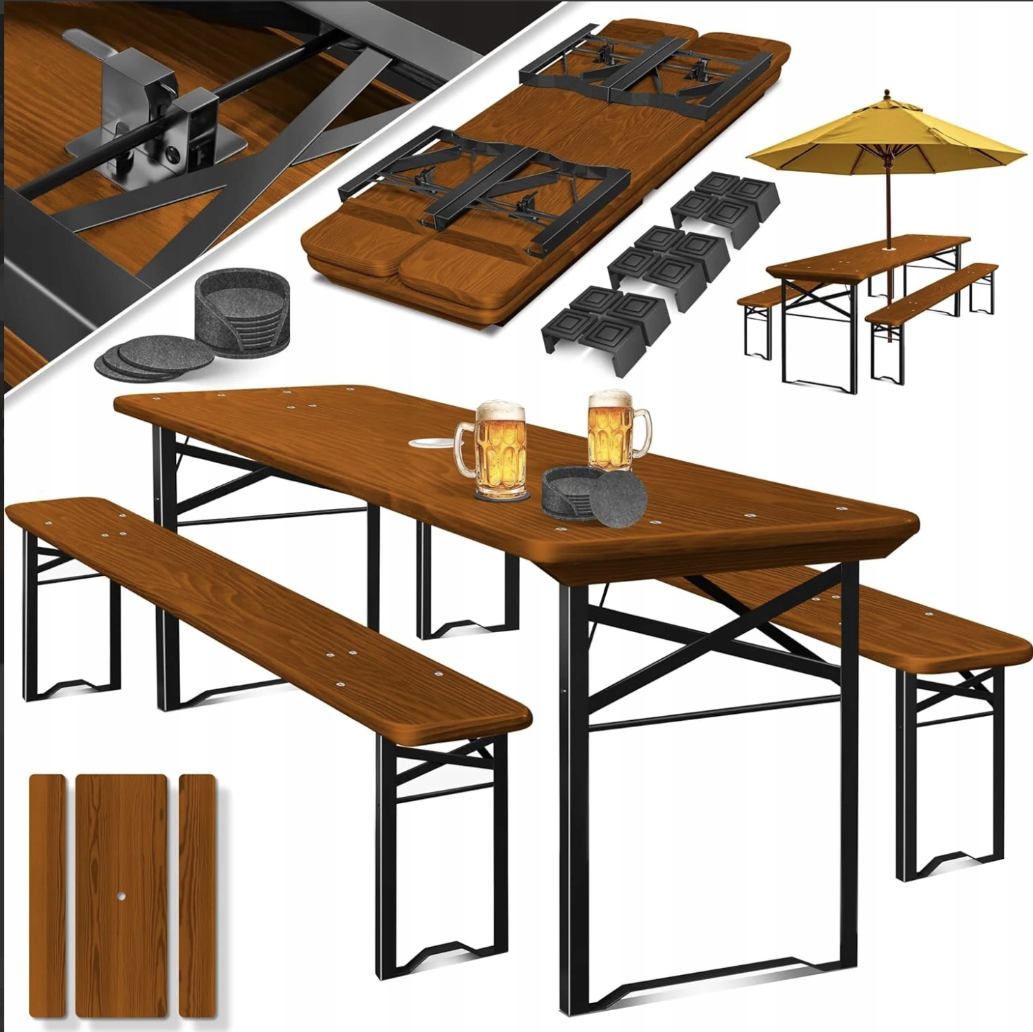 Zestaw jest solidny i trwały, zestaw do siedzenia z drewna i stali, składający się z dużego stołu i dwóch ławek. Przy dużej całkowitej długości, zestaw może pomieścić do 8 osób. Stół mierzy 170 cm x 46 cm x 75 cm i jest wyposażony w uchwyt parasola, który może pomieścić parasol o średnicy do 6 cm. Dwie ławki mają wymiary 170 cm x 23 cm x 46 cm.