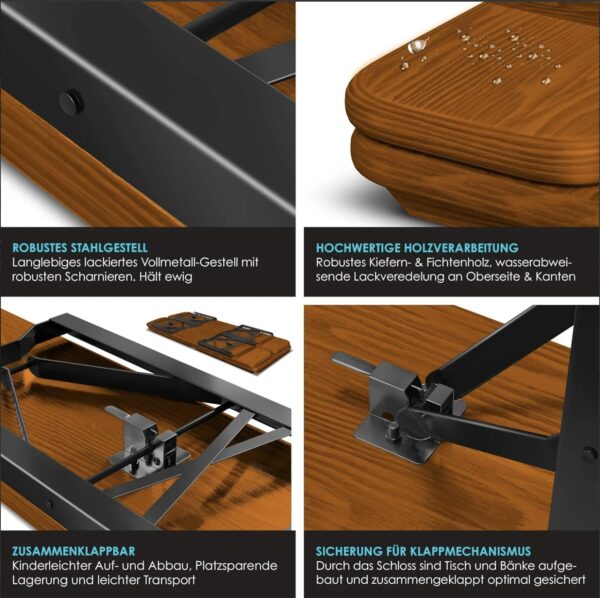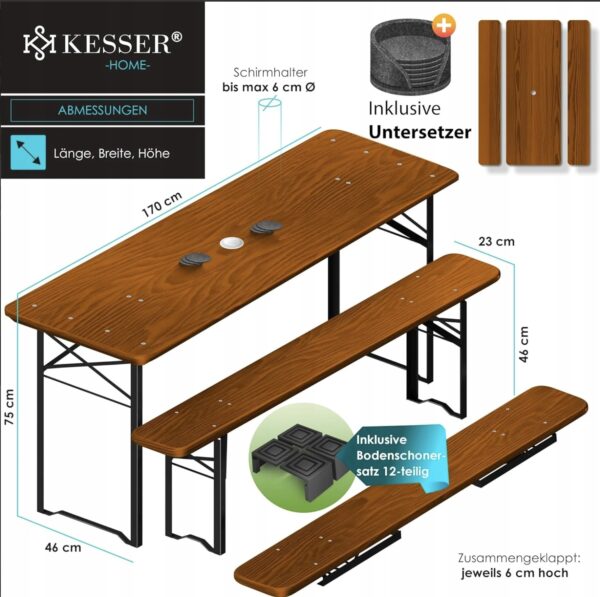 Zestaw jest solidny i trwały, zestaw do siedzenia z drewna i stali, składający się z dużego stołu i dwóch ławek. Przy dużej całkowitej długości, zestaw może pomieścić do 8 osób. Stół mierzy 170 cm x 46 cm x 75 cm i jest wyposażony w uchwyt parasola, który może pomieścić parasol o średnicy do 6 cm. Dwie ławki mają wymiary 170 cm x 23 cm x 46 cm.