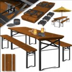 Stół i 2 x ławka, składany zestaw, stół 170 x 46 x 75cm oraz ławki 2 sztuki 170 cm x 23 cm x 46 cm., zestaw drewniany, ochraniacza podłogowy – 3-częściowy zestaw stół z dwoma ławkami, kolor ciemny brąz