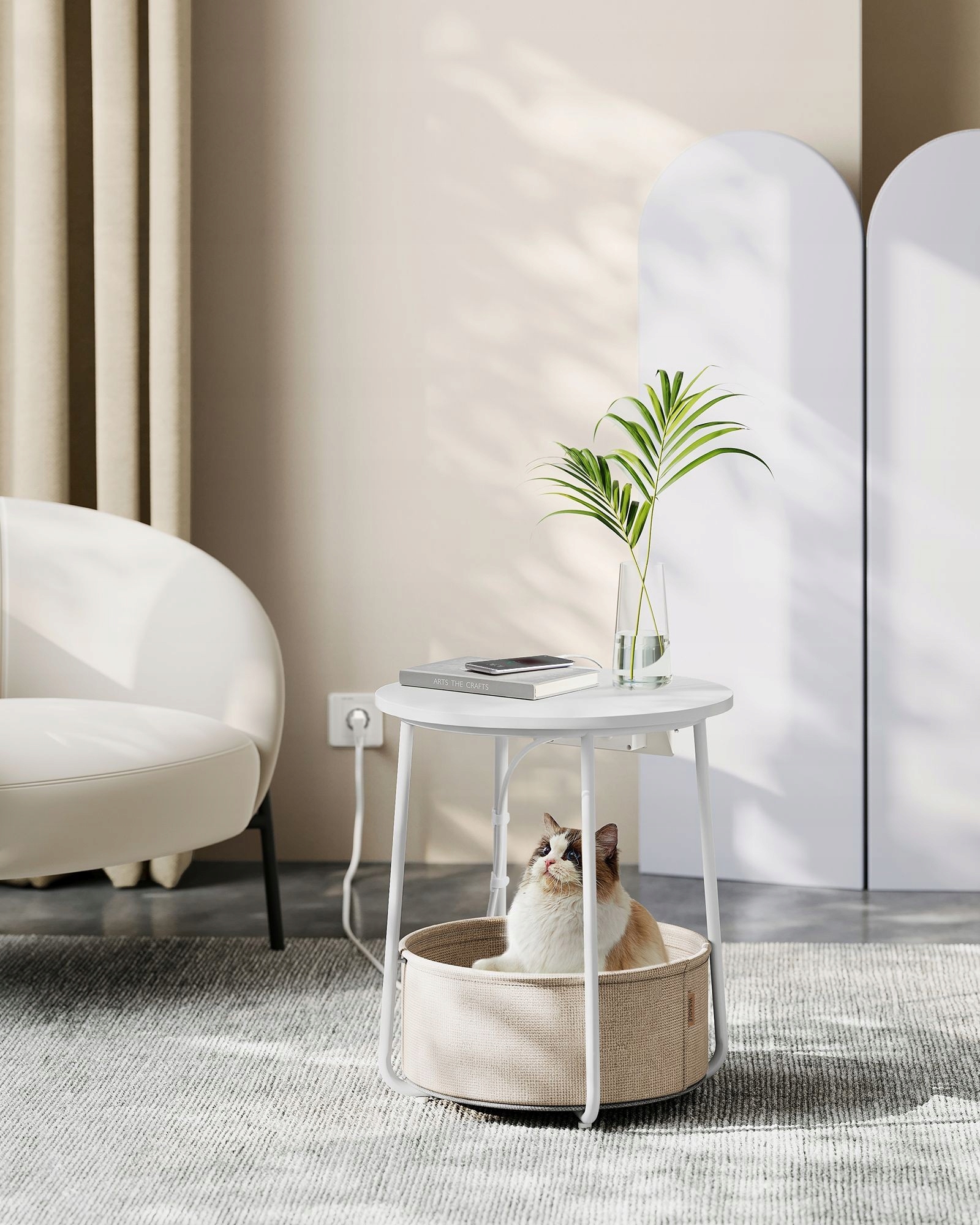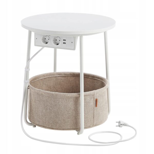 Stolik boczny okrągły z USB i gniazdkiem kosz VASAGLE biało-camelowym