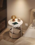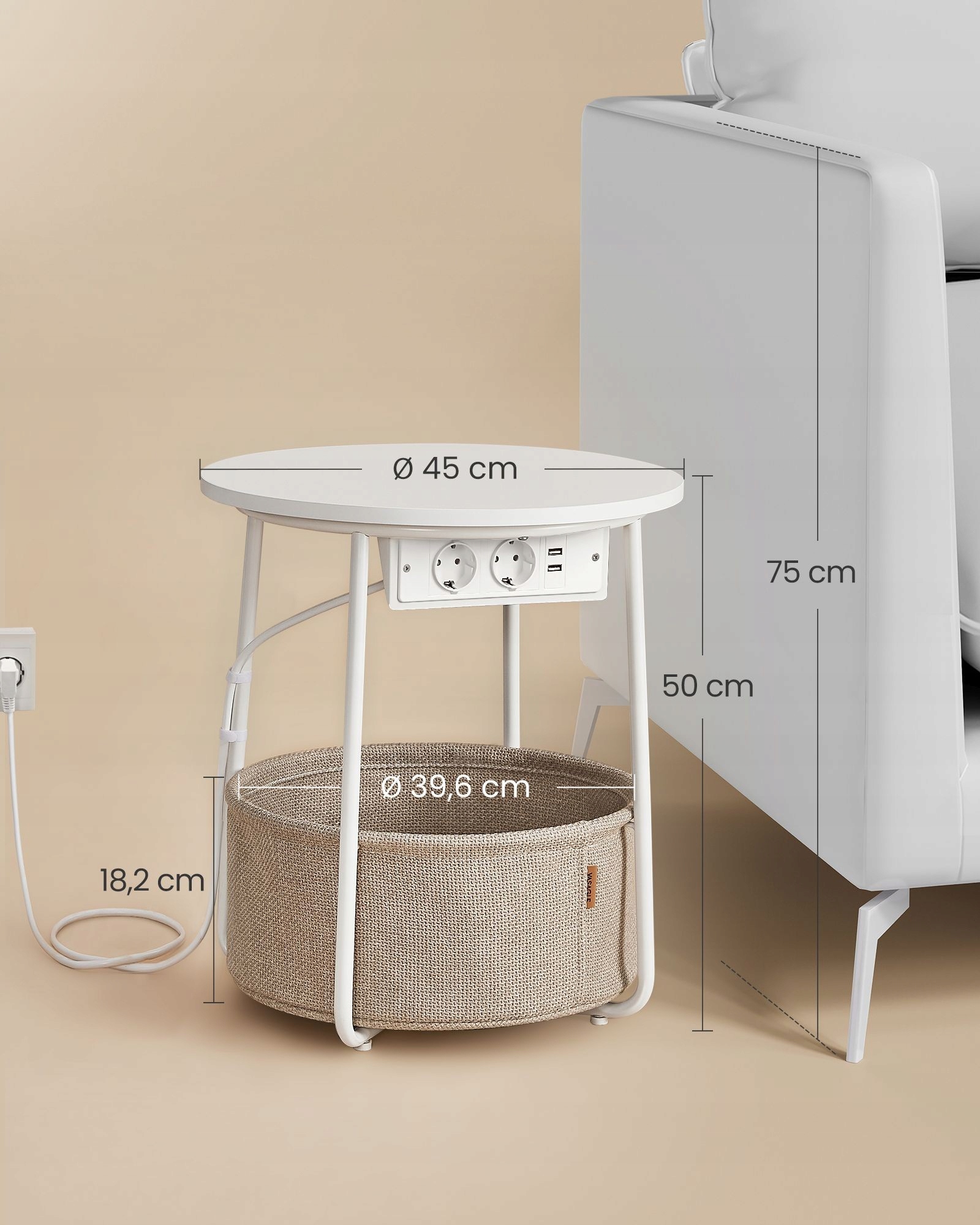 Stolik boczny okrągły z USB i gniazdkiem kosz VASAGLE biało-camelowym
