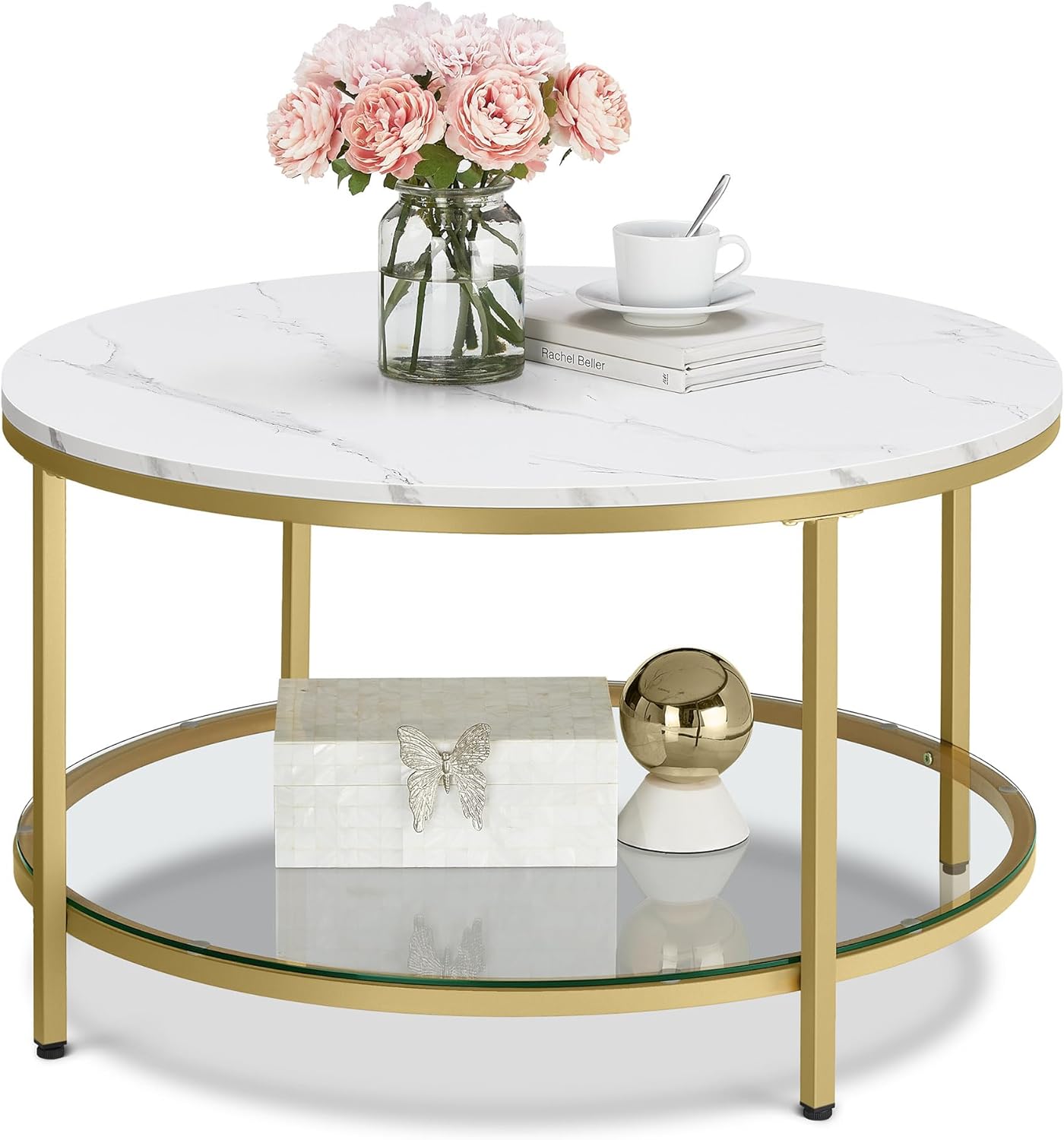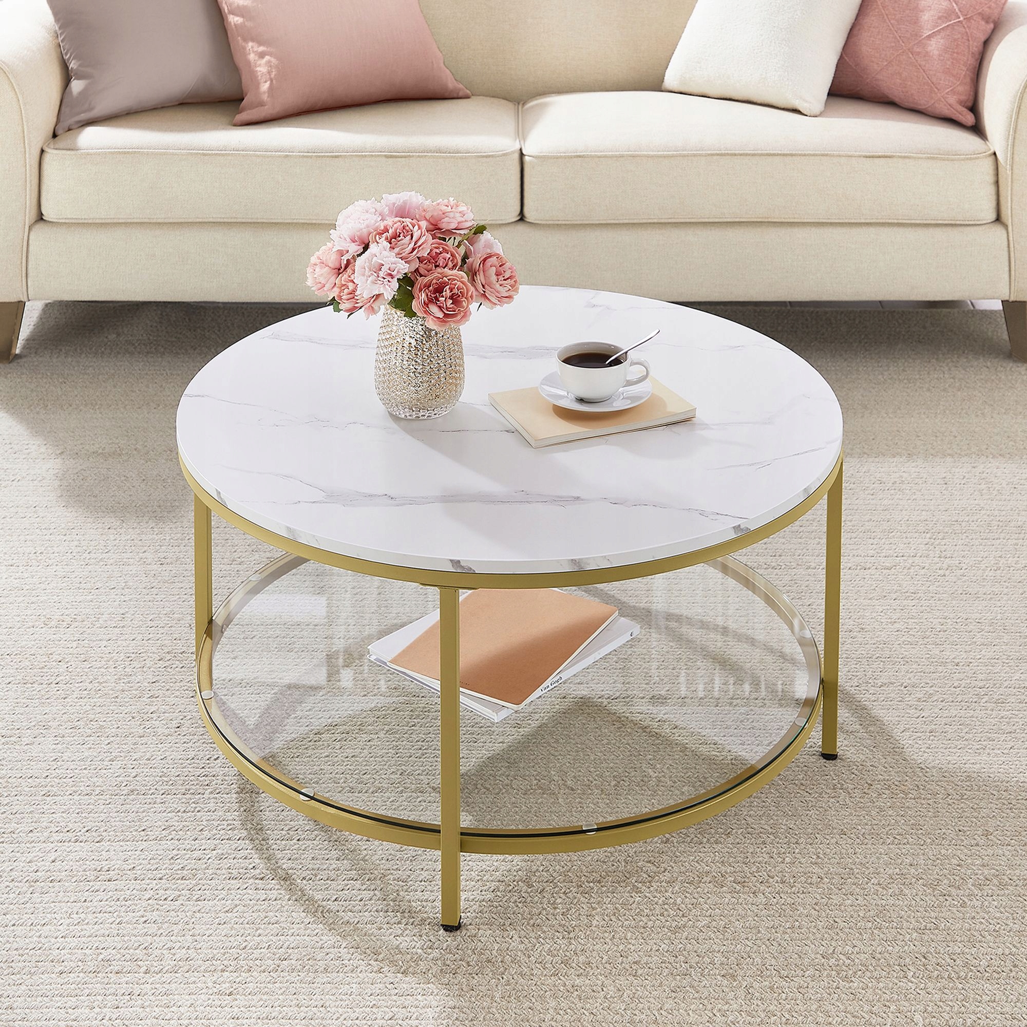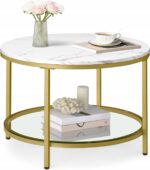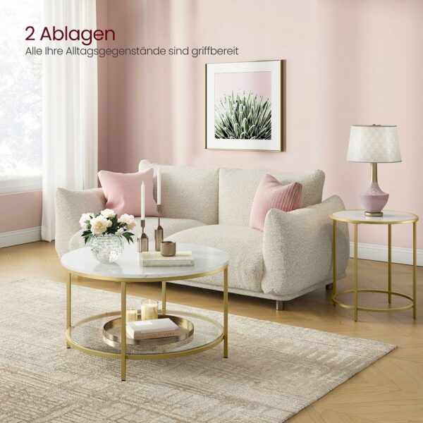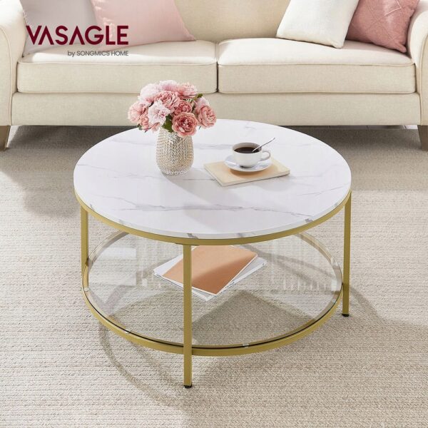 Dodaj elegancji swojemu salonowi dzięki stylowemu stolikowi kawowemu VASAGLE. Połączenie marmurkowego blatu, szklanej półki oraz złotych metalowych nóg tworzy wyjątkowy, nowoczesny design, który przyciąga wzrok i pasuje do wielu aranżacji wnętrz.