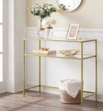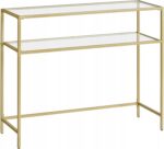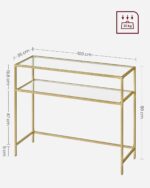 Nowoczesny stolik konsolowy VASAGLE to eleganckie połączenie złotej metalowej ramy i półek z hartowanego szkła. Minimalistyczny design sprawia, że mebel doskonale pasuje do salonu, przedpokoju, sypialni lub korytarza, dodając wnętrzu lekkości i stylu.