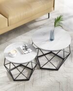 Zestaw dwóch okrągłych stolików kawowych VASAGLE to praktyczne i stylowe rozwiązanie do każdego wnętrza. Nowoczesne połączenie białych blatów i czarnej stalowej konstrukcji nadaje lekkości i elegancji, jednocześnie zapewniając funkcjonalność na co dzień.