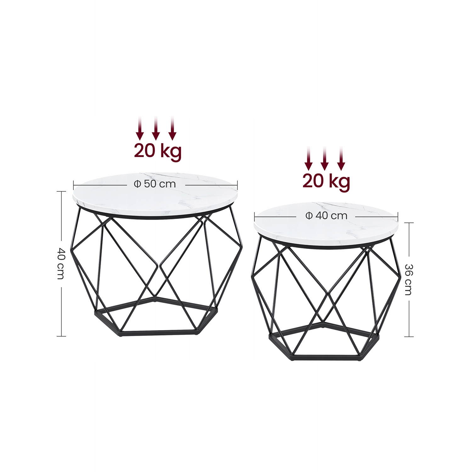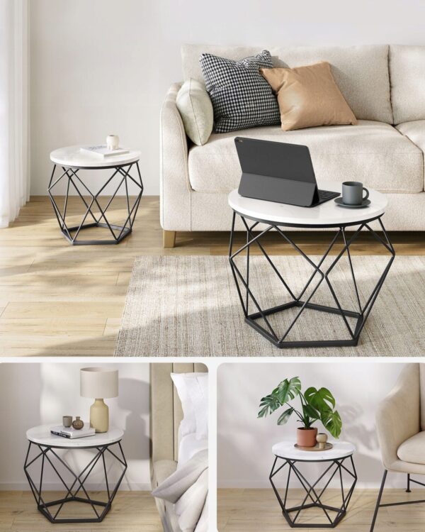 Stoliki mogą być używane razem lub osobno – jako zestaw w salonie albo oddzielne stoliki pomocnicze w różnych pomieszczeniach. Sprawdzą się jako miejsce na kawę, dekoracje, rośliny czy laptopa.