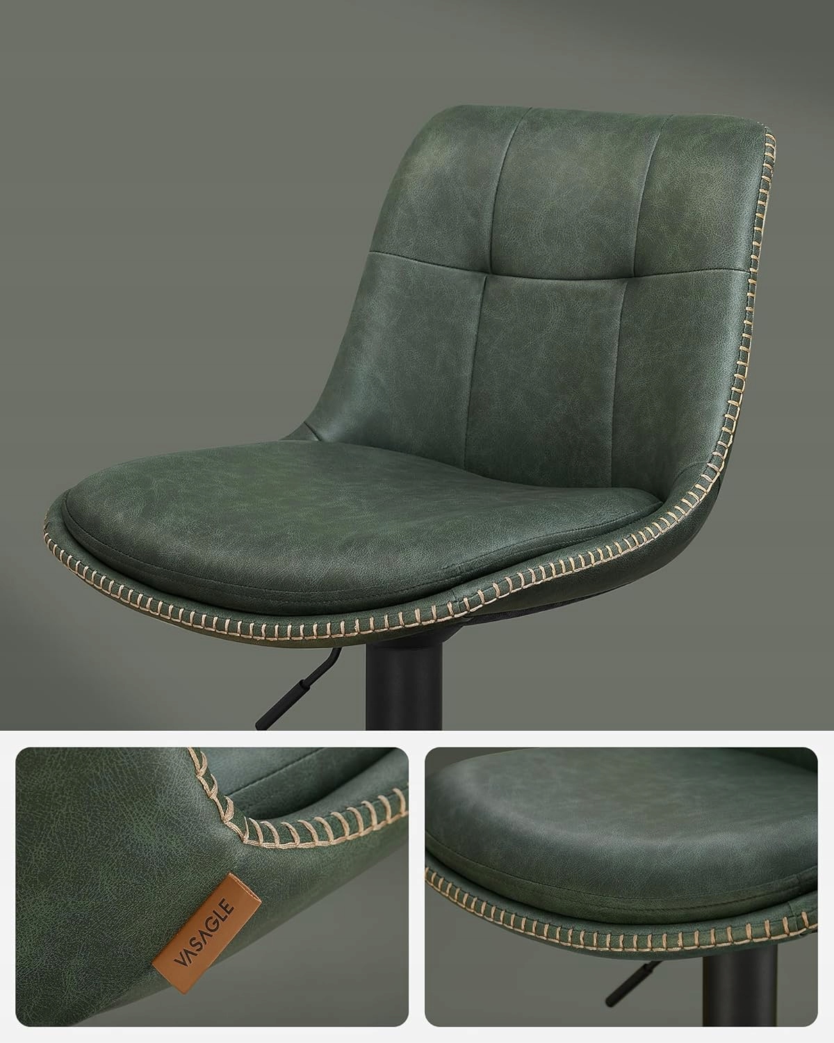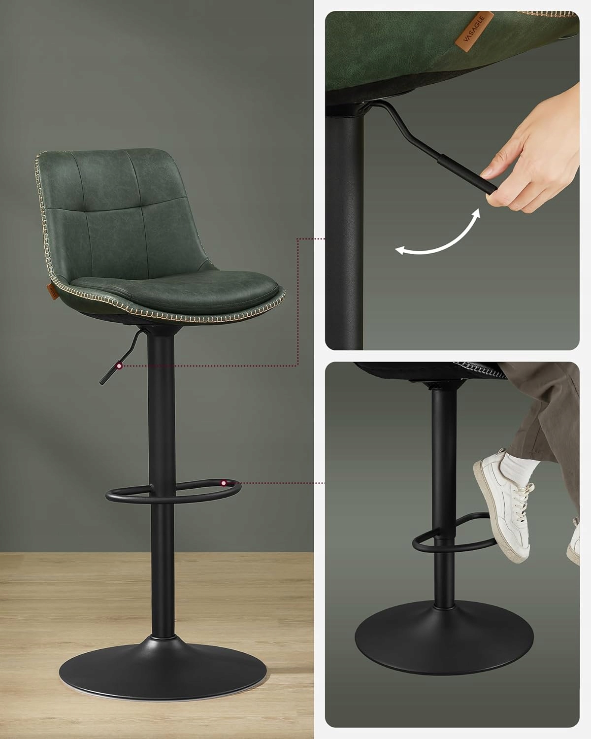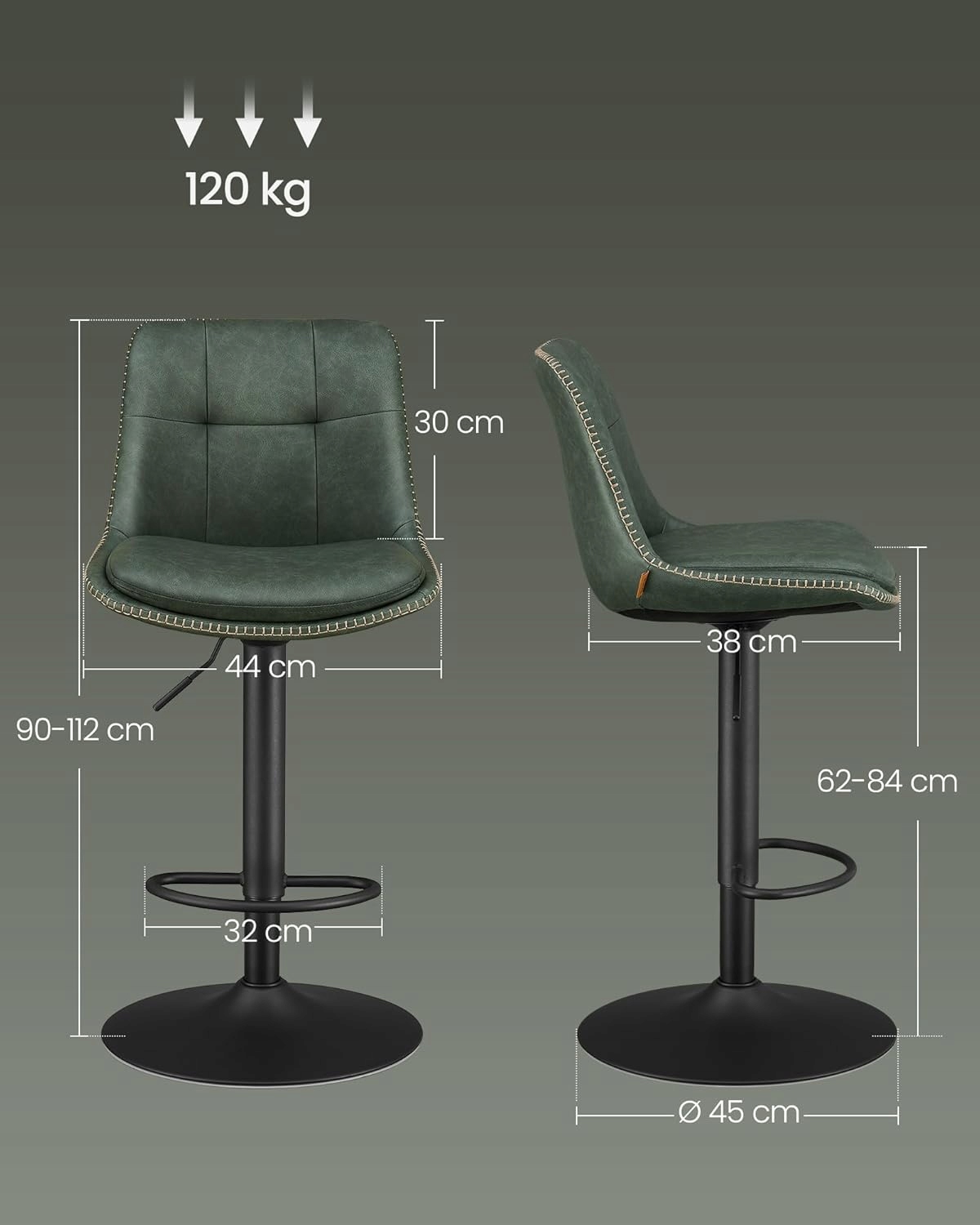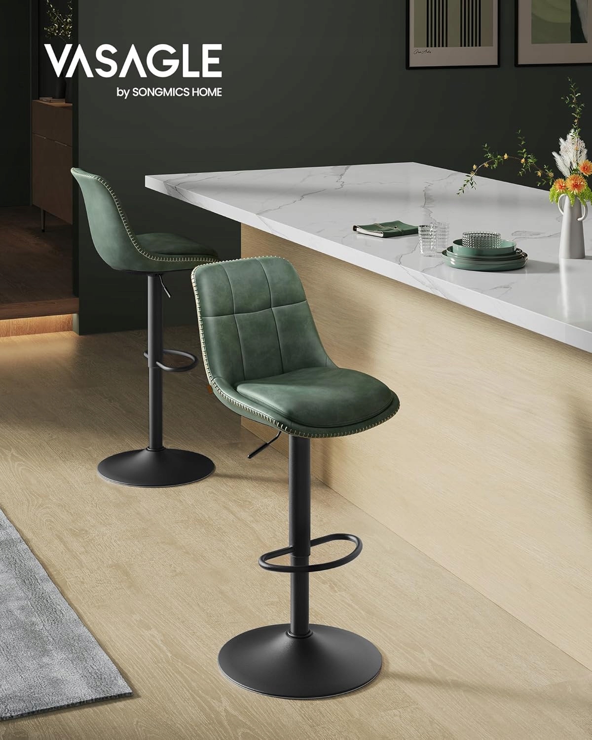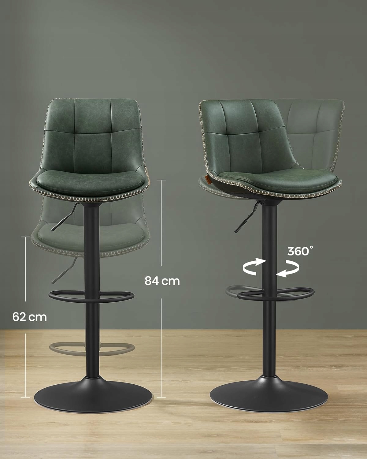 Zestaw 2 stołków barowych VASAGLE to połączenie nowoczesnego designu z wysokim komfortem użytkowania. Pikowane siedzisko w kolorze leśnej zieleni i stabilna stalowa konstrukcja sprawiają, że krzesła świetnie pasują do kuchni, jadalni, wyspy kuchennej lub domowego baru.