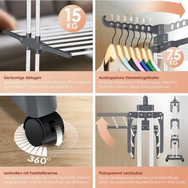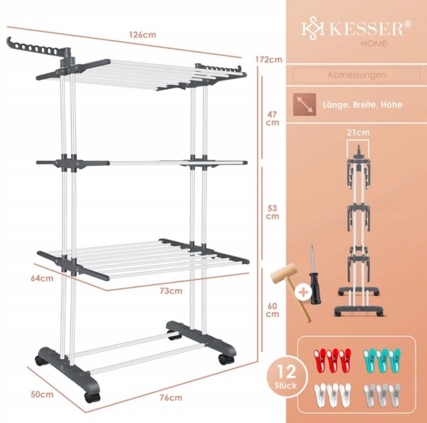 KESSER Wieszak na pranie – rozkładane skrzydła boczne, miejsce na 14 wieszaków, oszczędność miejsca, nośność 50 kilogramów, solidna konstrukcja podwójnych słupków, kółka 360° z hamulcem, elastyczne półki, 12 kolorowych klamerek do bielizny, przestronne półki, rozkładane uchwyty na wieszaki.
