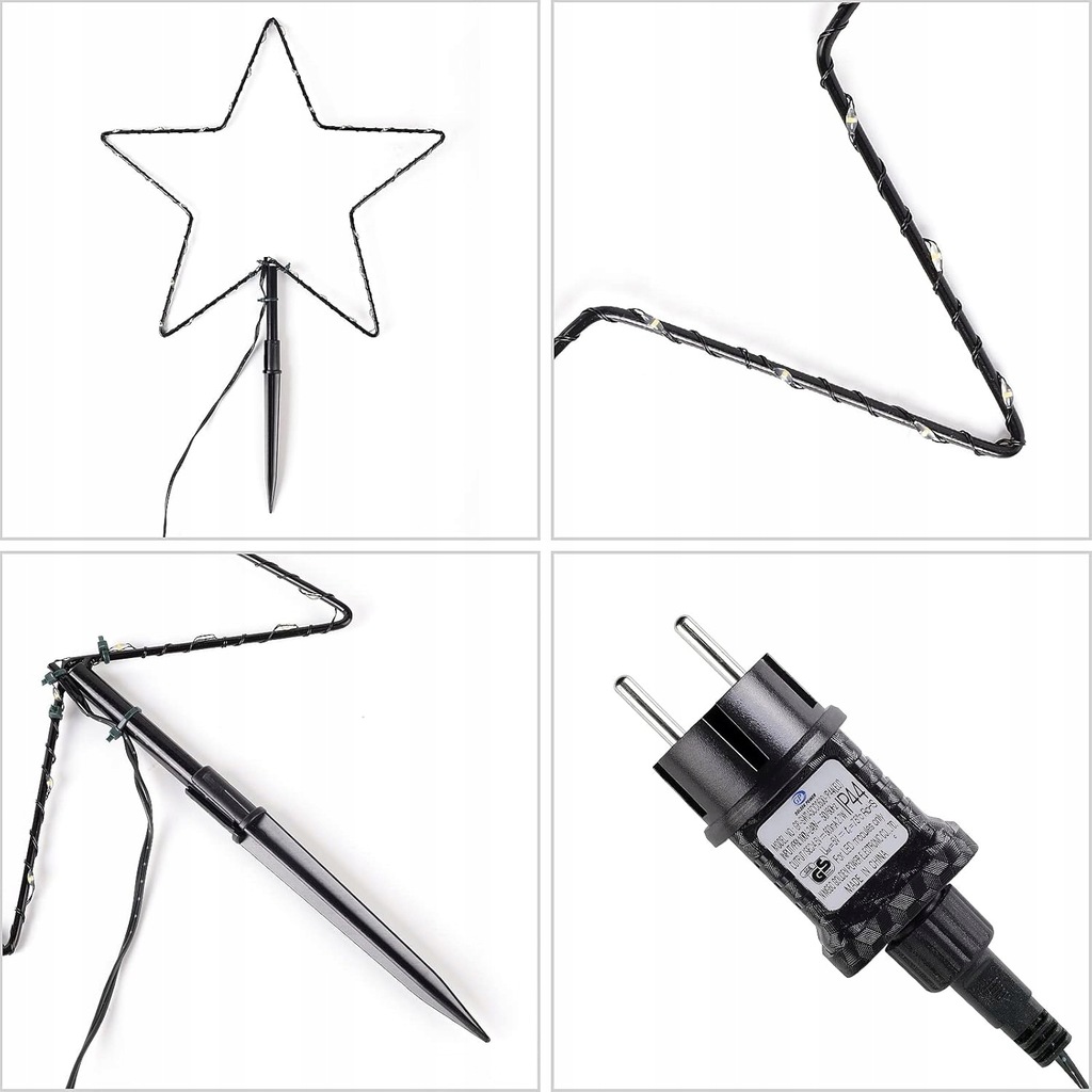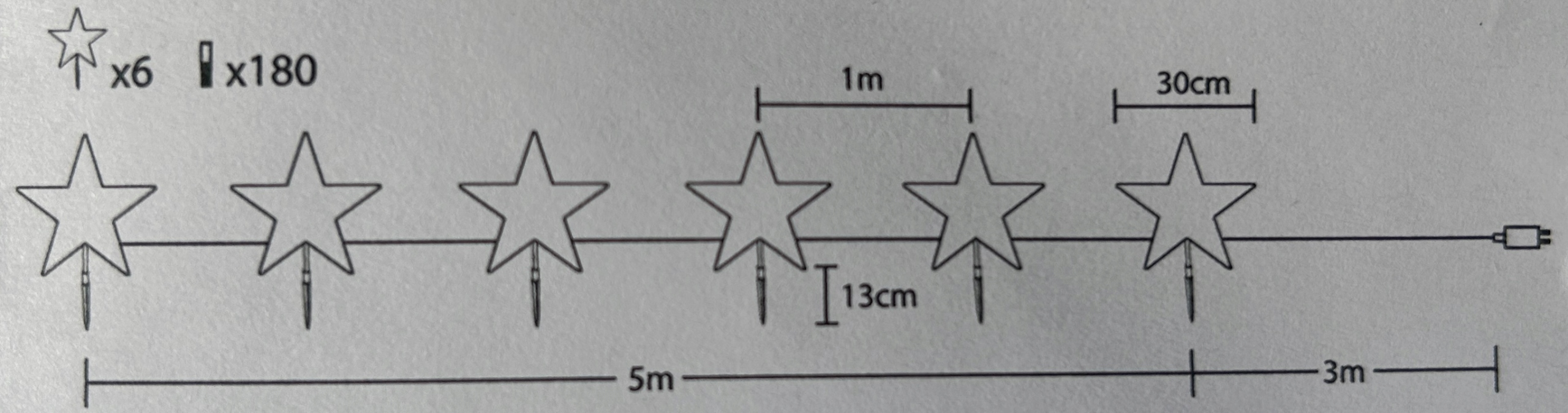 ✅ Stałe lampki choinkowe: Długość całkowita 8 m, przewód zasilający 3 m, odległość między światłami 1 m, średnica gwiazdy pięciokątnej 30 cm. Zasilanie 4,5 V, ilość gwiazdek: 6; kolor światła: ciepła biała.