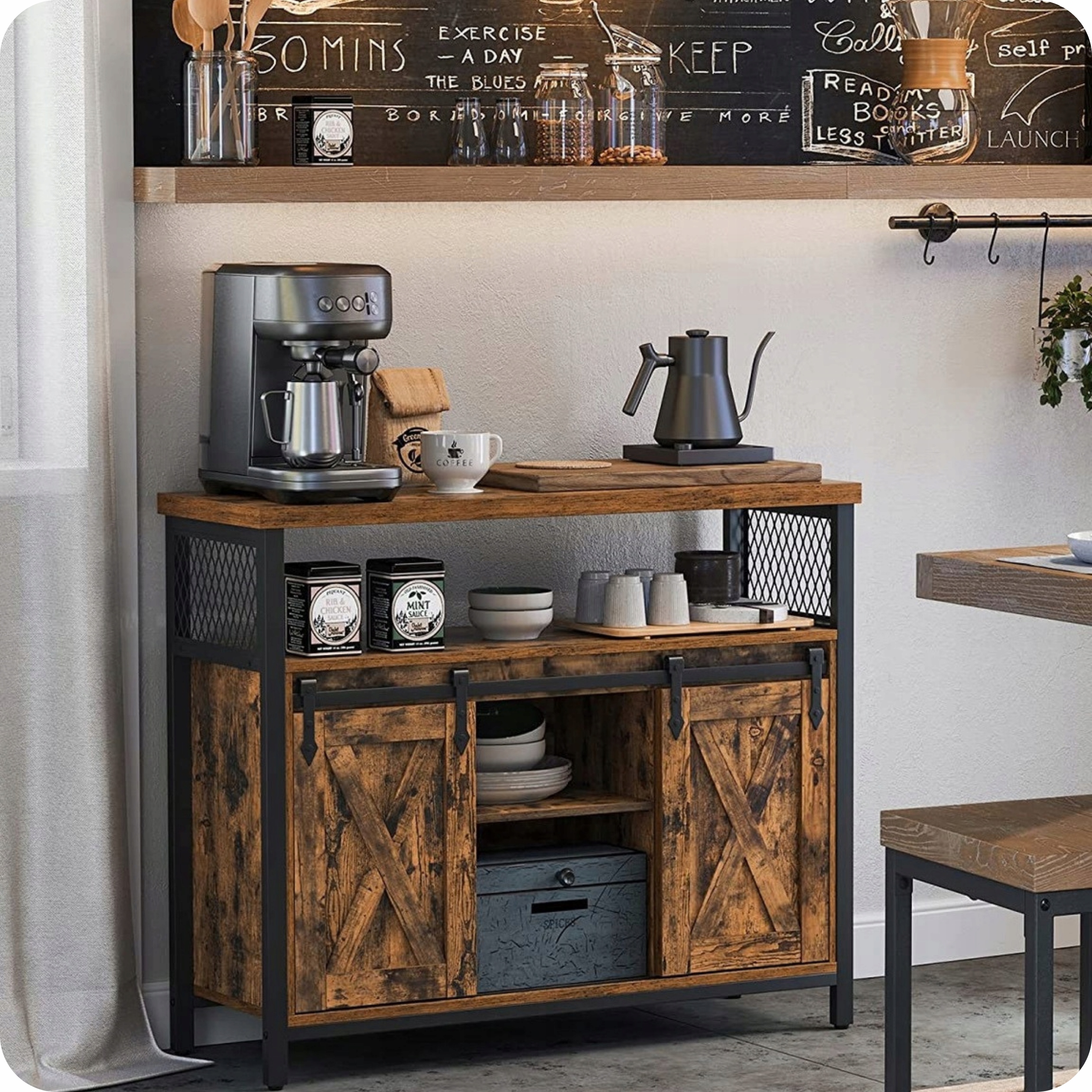 ✅ Stylowa i funkcjonalna: Ta szafka kuchenna łączy rustykalny brązowy blat, drzwi w stylu stodoły i metalowe wstawki, tworząc przyjemną atmosferę w jadalni, salonie czy kuchni. Industrialny design pasuje do każdego wnętrza, dodając mu charakteru.