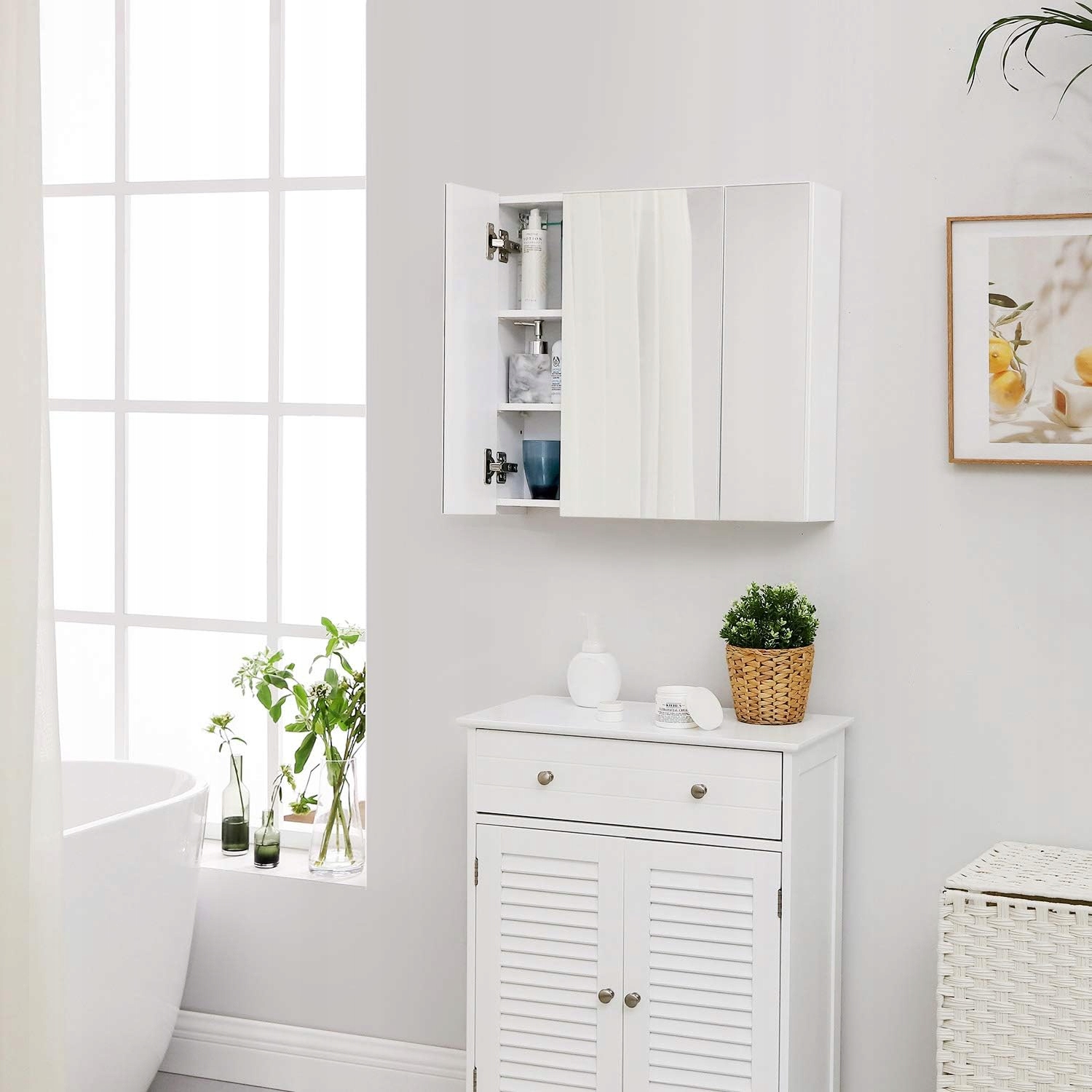 Szafka łazienkowa z lustrem 3 drzwi 60 cm biała VASAGLE