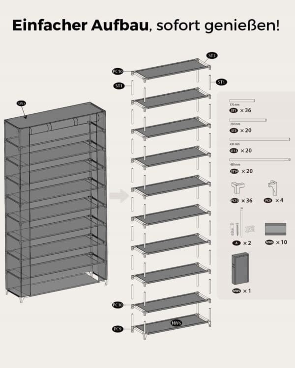 ✅ Montaż odbywa się poprzez prosty system wsuwania elementów i nie wymaga narzędzi. Dzięki niewielkiej szerokości produkt zajmuje mało miejsca a jednocześnie oferuje dużą pojemność. Sprawdzi się w przedpokoju sypialni salonie lub garażu.