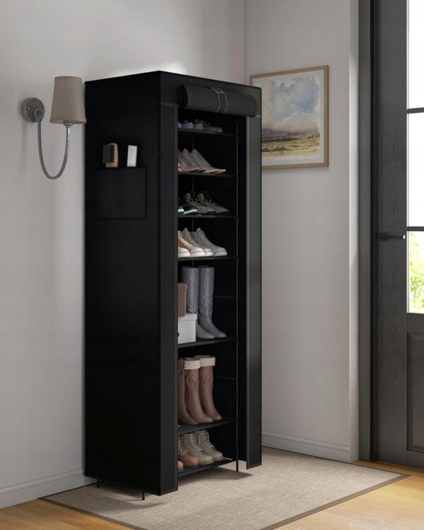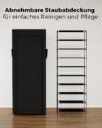 ✅ Zamykany pokrowiec z wytrzymałej włókniny chroni obuwie przed kurzem i wilgocią, a duże przednie otwarcie z roletową klapą umożliwia szybki dostęp bez zdejmowania całej osłony. Materiał pokrowca jest wodoodporny i łatwy do czyszczenia.