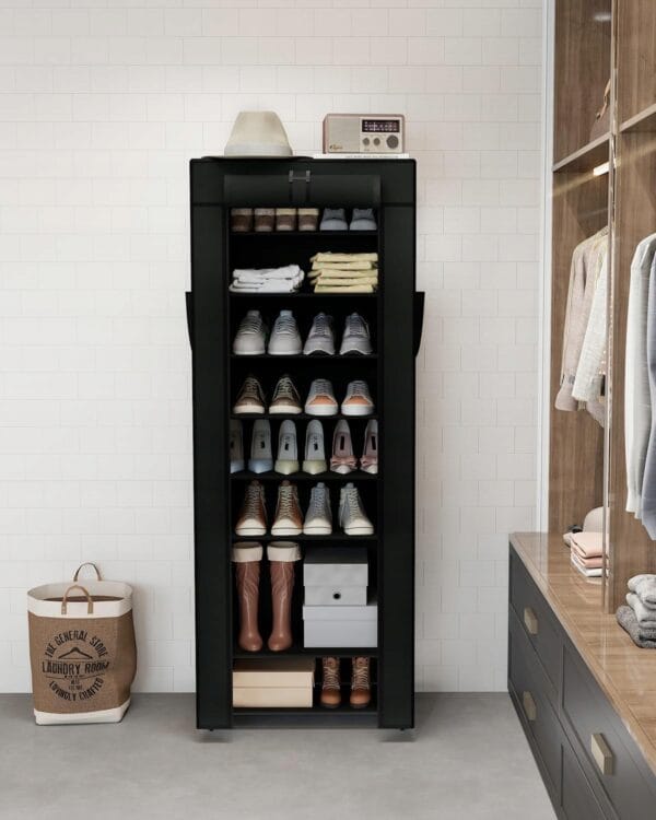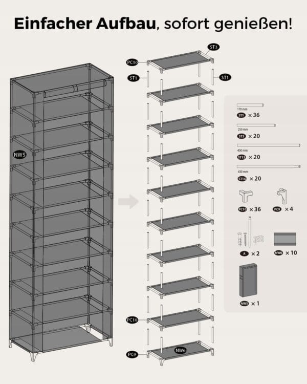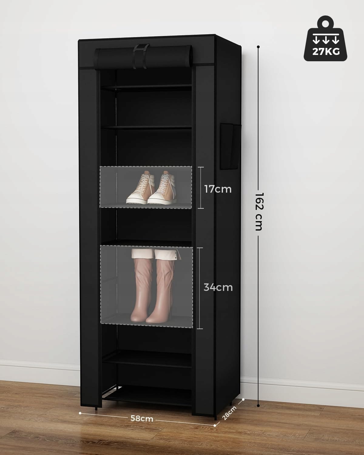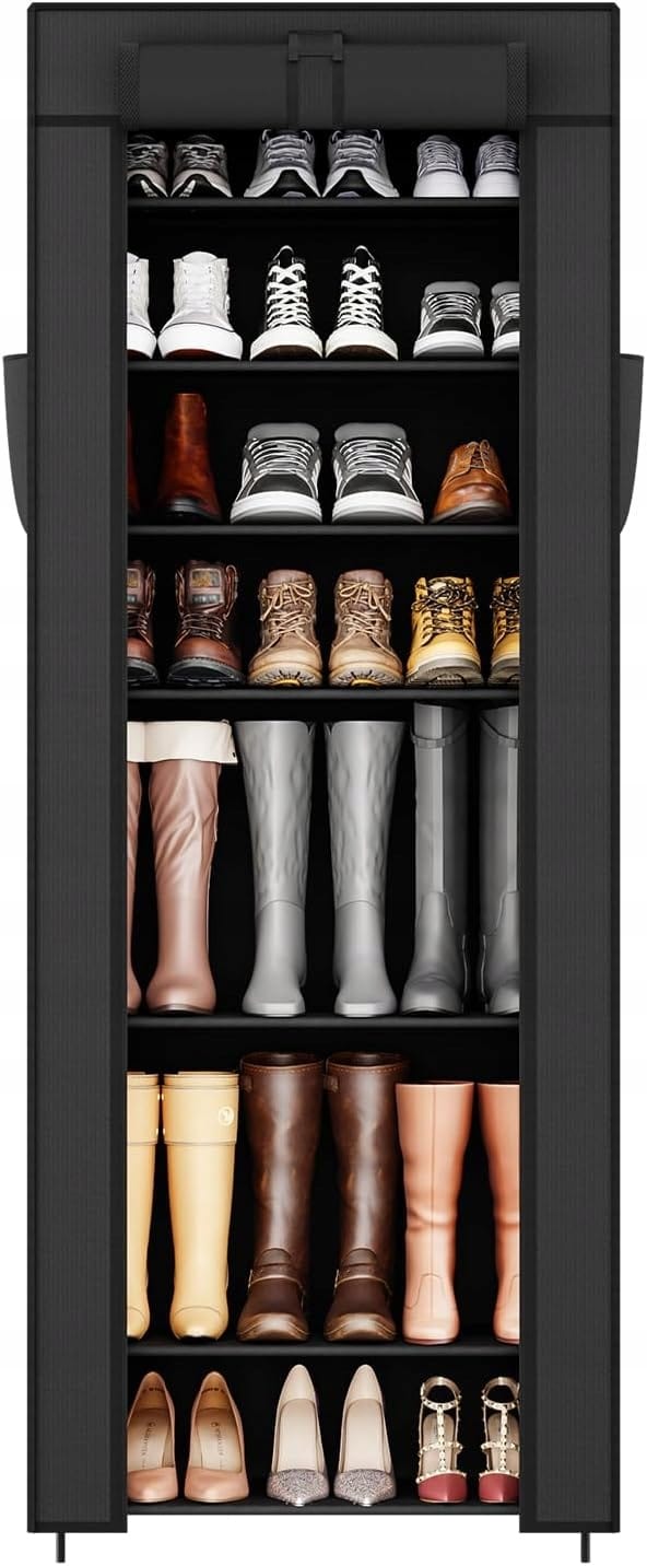 ✅ Stabilną konstrukcję zapewniają metalowe rurki, wzmacniane łączniki z tworzywa oraz odporna na wilgoć tkanina. Każda półka wytrzymuje do 10 kg, dzięki czemu regał nadaje się również do cięższych butów. Mebel ma wąską formę, więc nie zajmuje dużo miejsca, jednocześnie oferując dużą pojemność.