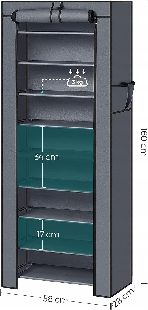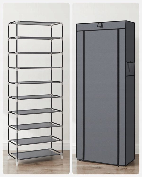 ✅ Lekka, ale stabilna konstrukcja oparta na stalowych rurkach zapewnia trwałość, a materiałowy pokrowiec z zamkiem błyskawicznym chroni obuwie przed kurzem. Dodatkowe kieszenie boczne pozwalają przechowywać akcesoria, takie jak szczotki czy pasty.