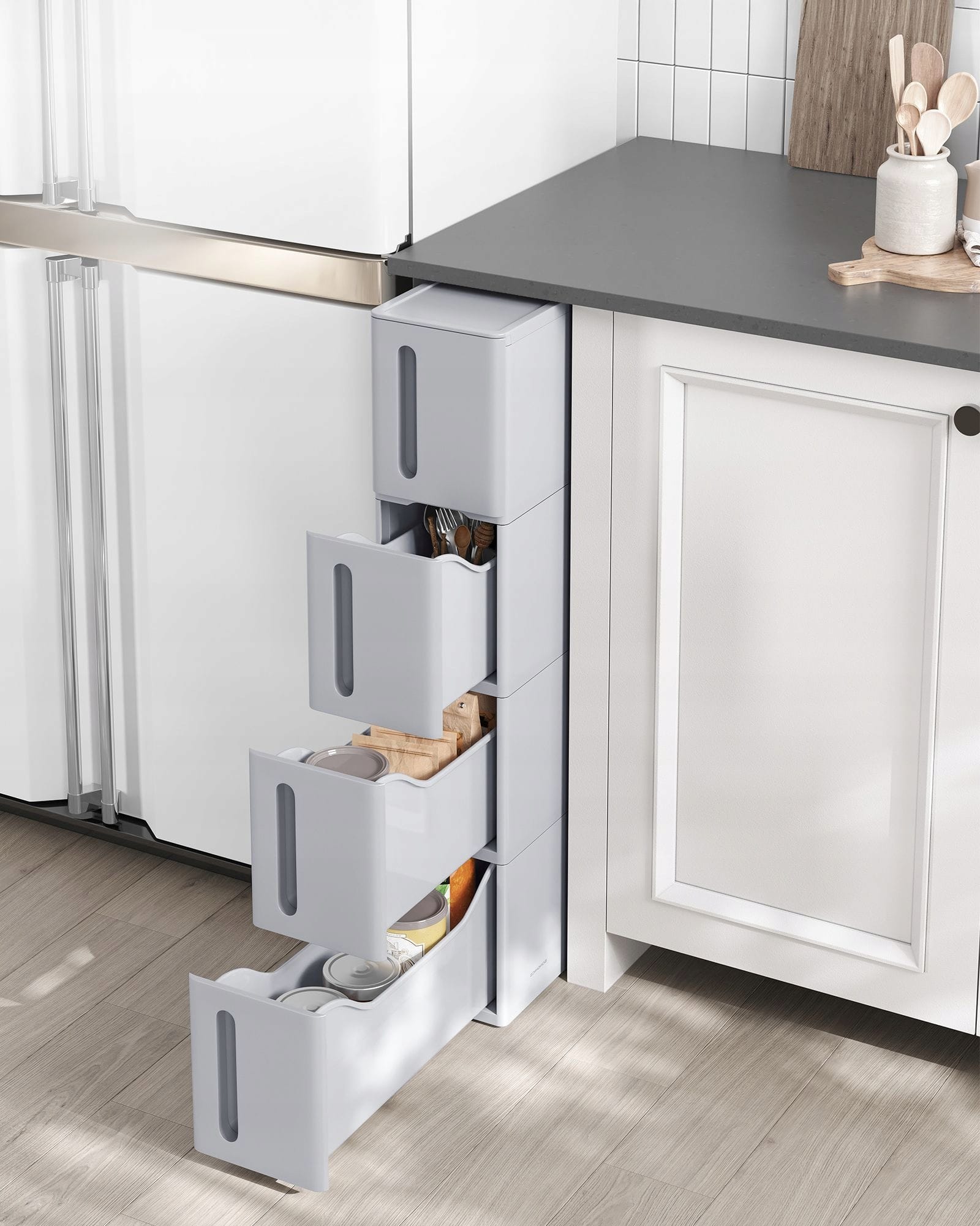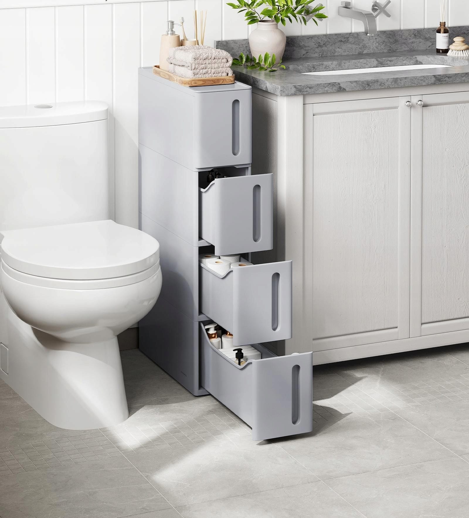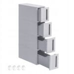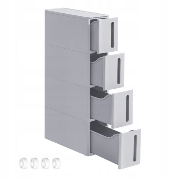 Wyposażona w 4 pojemne szuflady, pozwala wygodnie przechowywać kosmetyki, środki czystości czy akcesoria domowe. Zamknięta konstrukcja chroni zawartość przed kurzem, a trwałe tworzywo PP zapewnia odporność na wilgoć i długą żywotność.