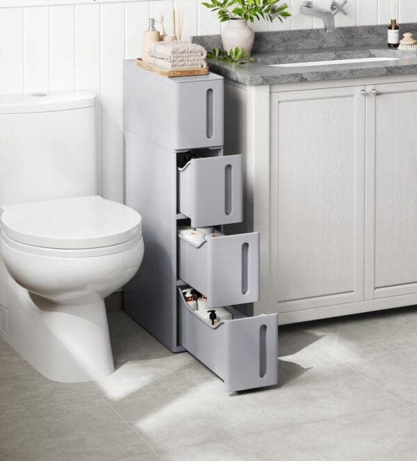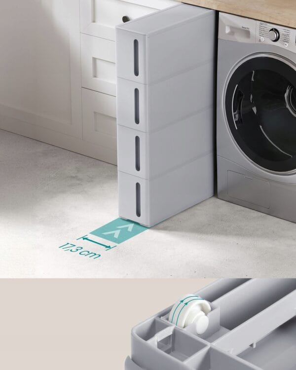 Praktyczna i kompaktowa szafka SONGMICS to idealne rozwiązanie do małych przestrzeni. Dzięki szerokości zaledwie 17,3 cm świetnie sprawdzi się w łazience, kuchni, pralni czy sypialni, pomagając maksymalnie wykorzystać dostępne miejsce.