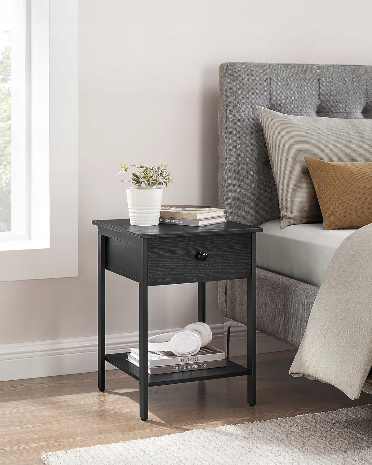 Praktyczny układ pozwala mieć wszystko pod ręką: lampkę lub okulary na blacie, drobiazgi w szufladzie, a książki czy kapcie na dolnej półce.