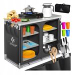 Praktyczna kuchnia kempingowa z aluminiowym stelażem, półkami MDF i dużą ilością miejsca do przechowywania