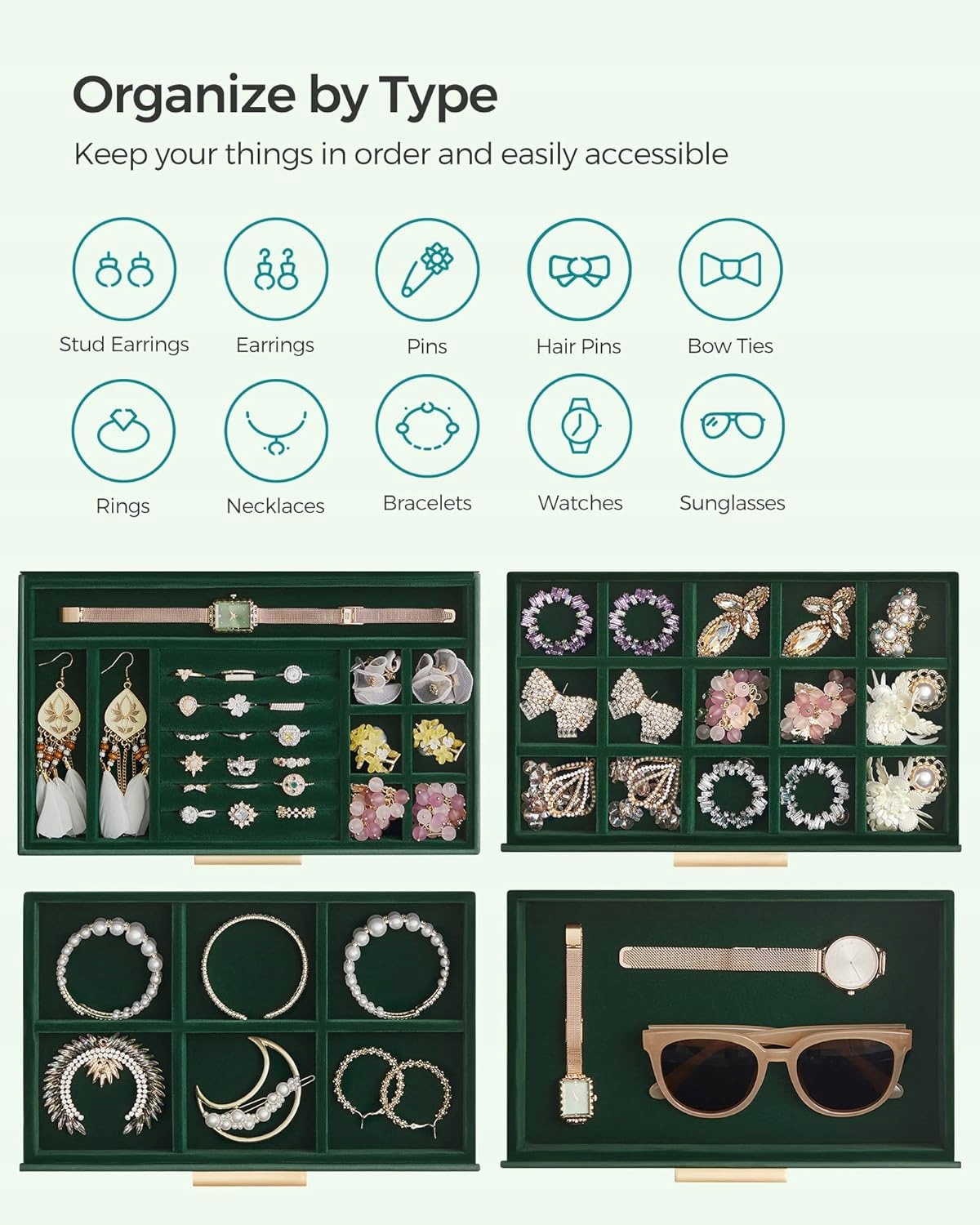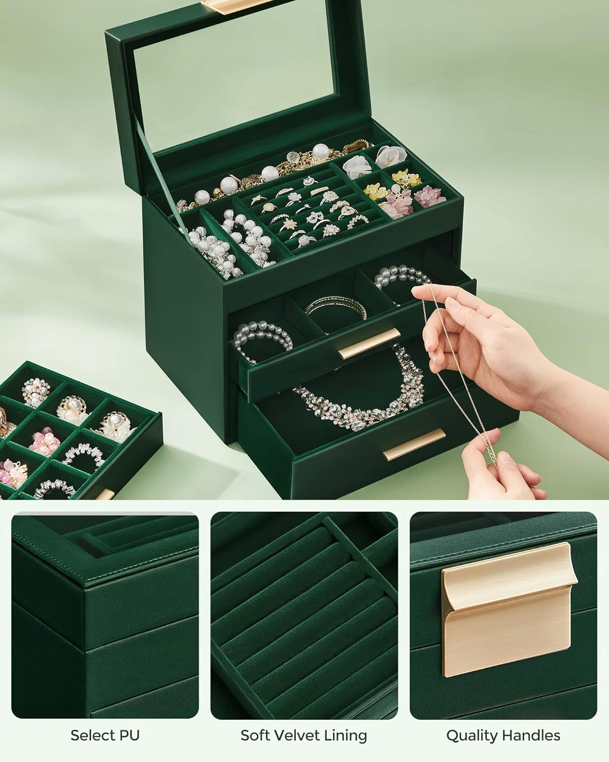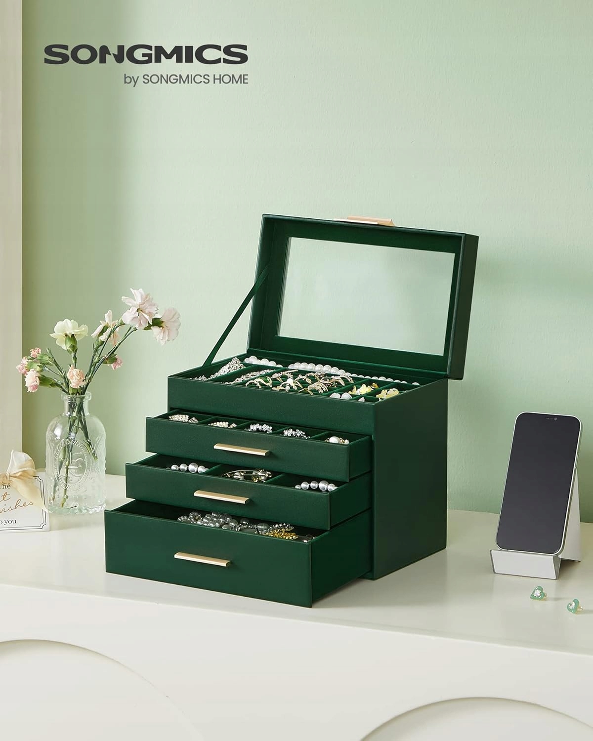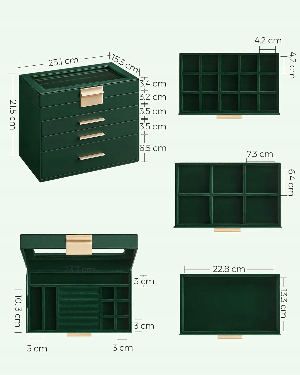 Szkatułka na biżuterię 4 poziomy z szufladami szkło zielona SONGMICS