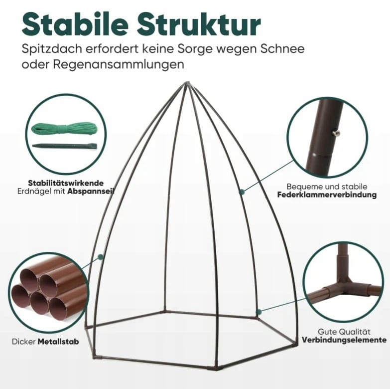 ✅ Innowacyjna konstrukcja z sześciokątną podstawą oraz spiczastym dachem zapobiega gromadzeniu się wody i śniegu, zapewniając roślinom optymalną ochronę przez cały sezon. Szklarnia została wyposażona w wytrzymałą folię PE o gramaturze 135 g/m², która skutecznie chroni przed deszczem, wiatrem, śniegiem oraz nadmiernym nasłonecznieniem.