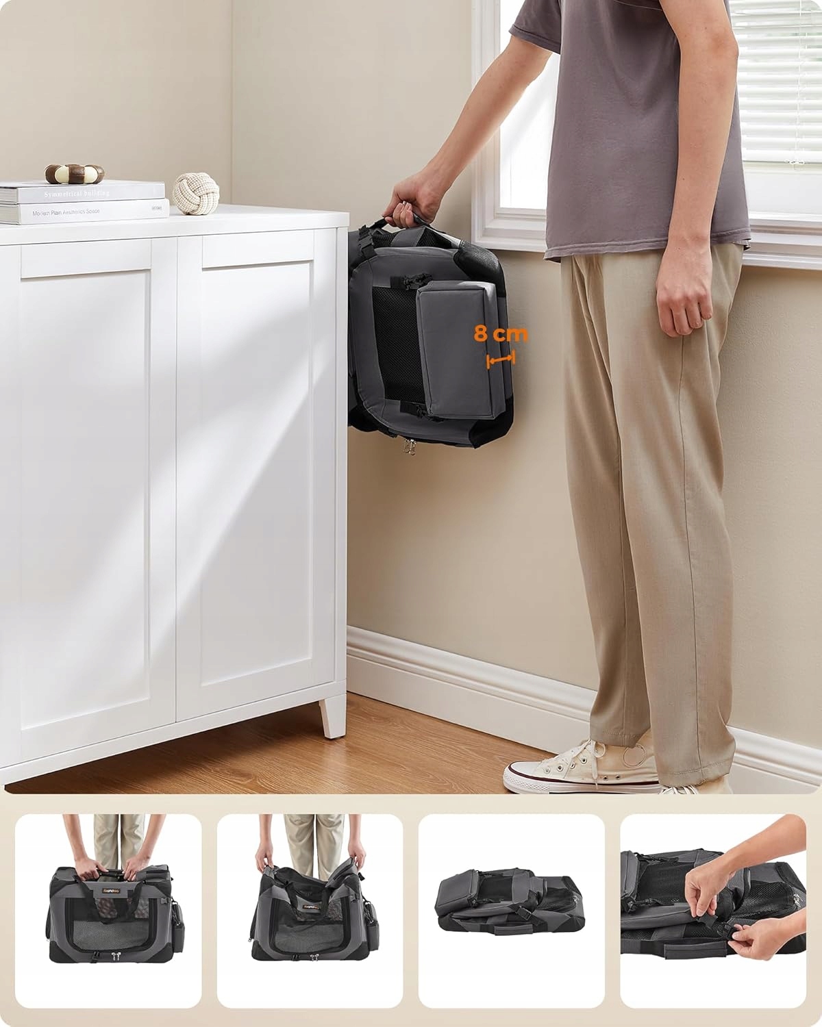 ✅ Składana konstrukcja pozwala łatwo przechowywać transporter, gdy nie jest używany, a wygodne uchwyty ułatwiają przenoszenie. Dzięki solidnej metalowej ramie i wytrzymałej tkaninie Oxford produkt jest stabilny i trwały.