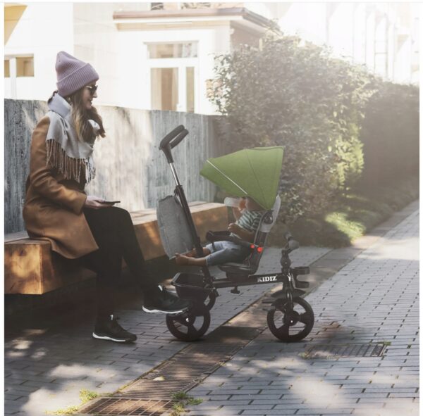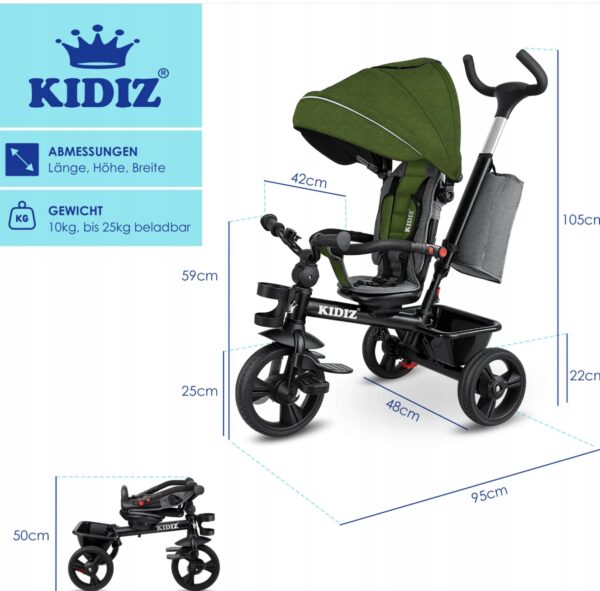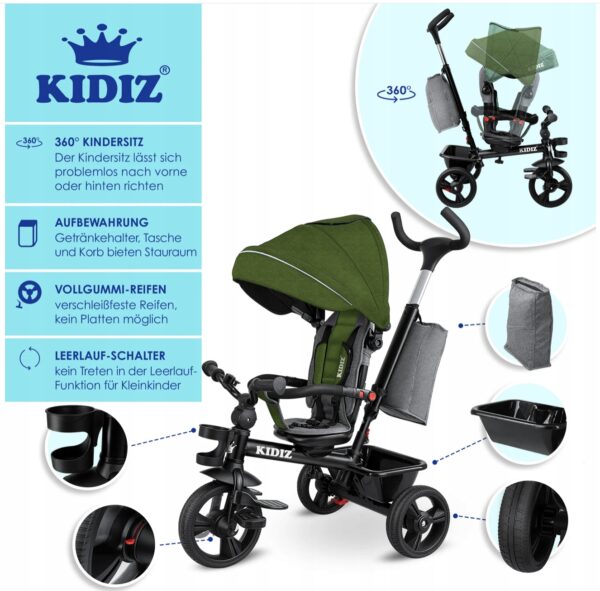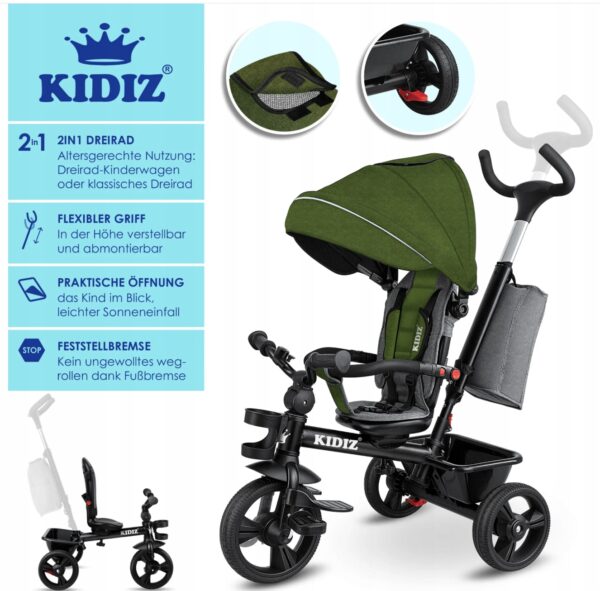 Trójkołowiec KIDIZ to funkcjonalne i rosnące razem z dzieckiem rozwiązanie, które łączy funkcje wózka dziecięcego i trójkołowca. Dzięki innowacyjnemu systemowi sterowania za pomocą rączki, rodzice łatwo kontrolują kierunek jazdy. Siedzisko można obracać o 360°, a składane daszek chroni przed słońcem. Trójkołowiec można używać jako wózek, pomoc do nauki chodzenia, trójkołowiec z kierownicą oraz samodzielny trójkołowiec.