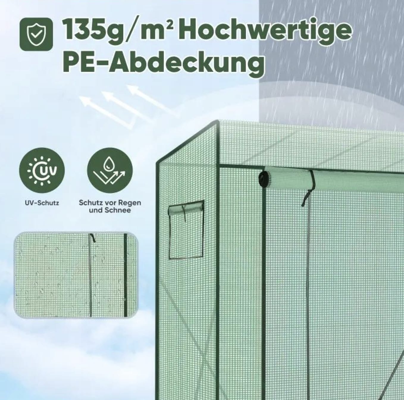 Wysokiej jakości półprzezroczysta folia PE o gramaturze 140 g/m² przepuszcza światło słoneczne jednocześnie zatrzymując ciepło i wilgoć. Dzięki temu wewnątrz powstaje stabilne i naturalne środowisko sprzyjające wzrostowi delikatnych roślin oraz zwiększające ich przeżywalność.